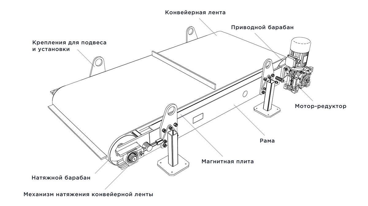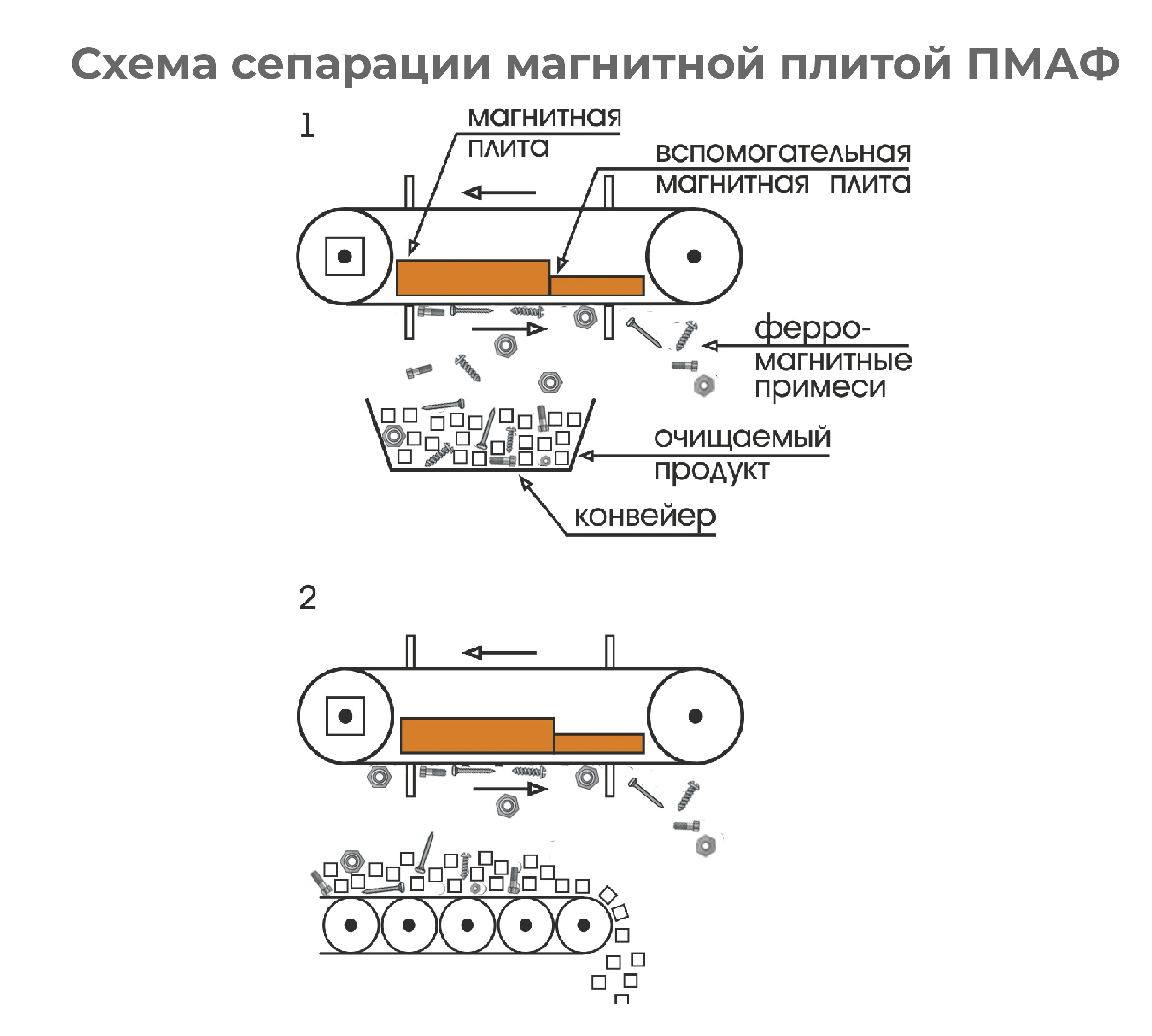 В процессе транспортирования сыпучих продуктов основным конвейером они проходят через воздействие магнитного поля сепаратора. Металлические частицы, содержащиеся в исходном продукте примагничиваются к плите через ленту сепаратора.