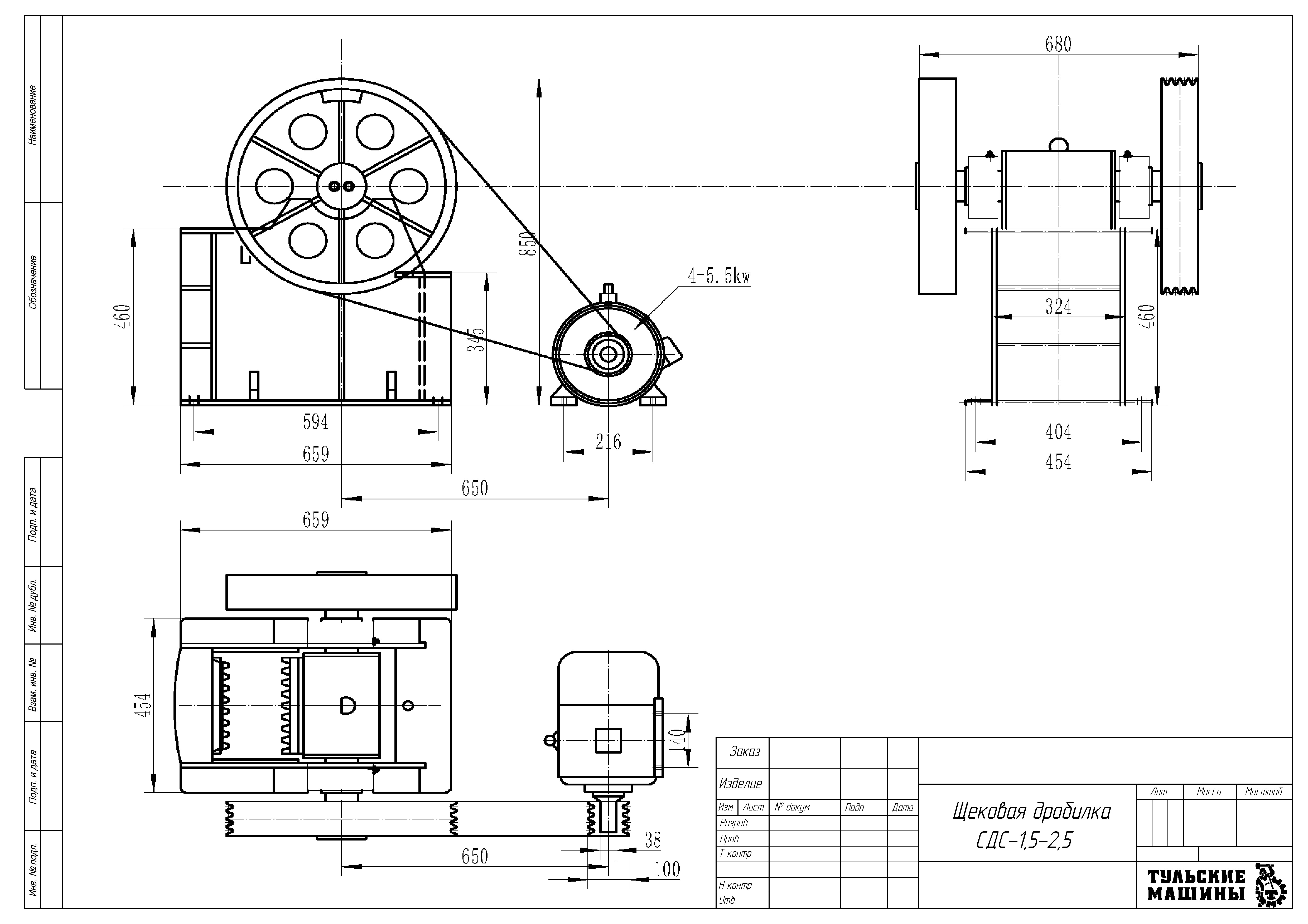 Дробилка состоит из корпуса, на котором смонтирована подвижная щека с двигающейся дробящей плитой, валом и подшипниками. На передней стенке корпуса закреплена с неподвижная дробящая плита.