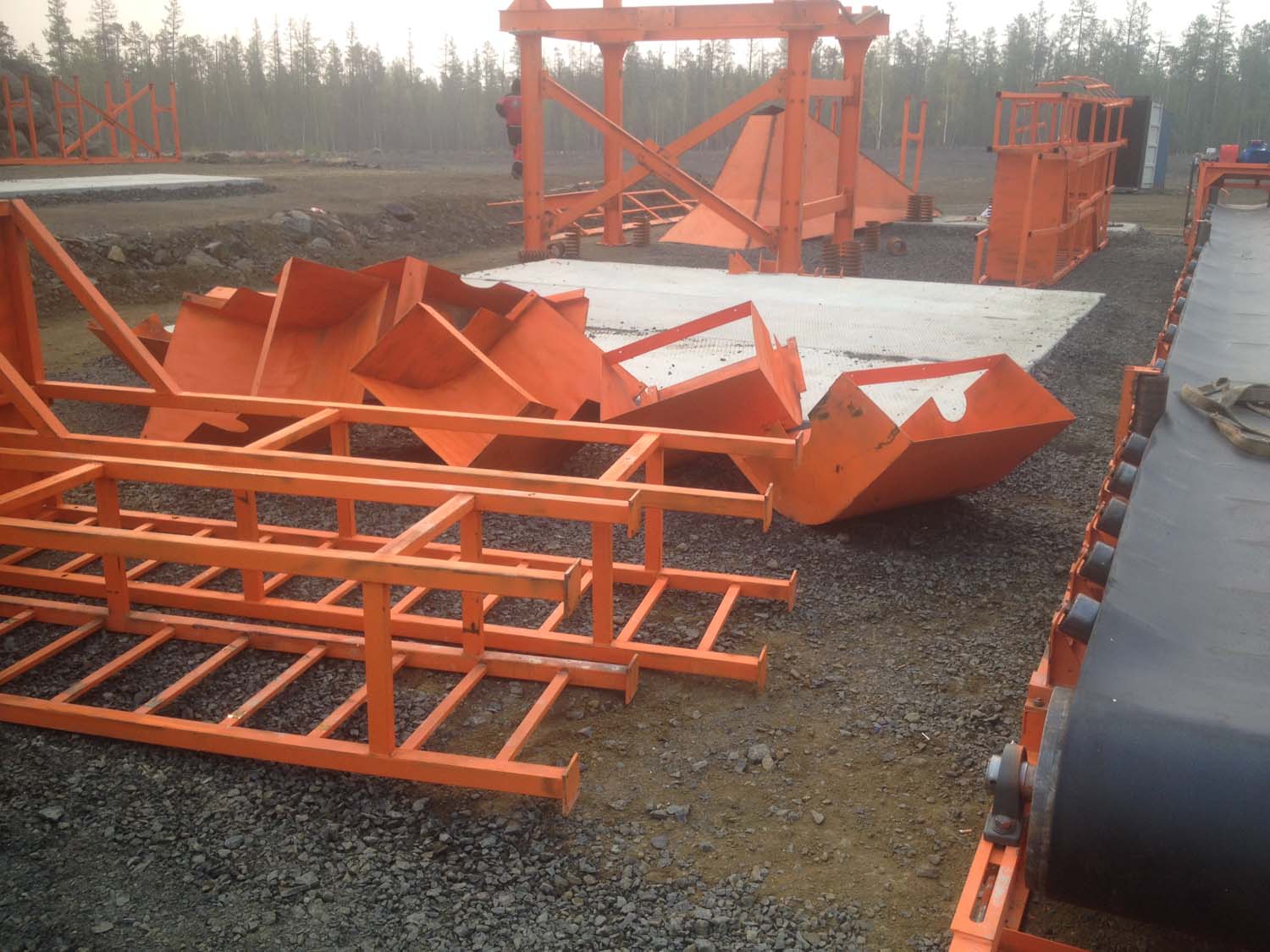 Исходный материал подается на дробление с помощью пластинчатого питателя ТК-16. Загрузка приемного бункера питателя возможна как автосамосвалами, так и ковшовым погрузчиком. Измельчённый материал с помощью ленточного конвейера подается на инерционный грохот для товарной классификации. Товарный продукт представляет собой кубовидный щебень щебень товарных фракций 5-20, 20-40, 40-70. Размер фракций может быть любым по желанию Заказчика.