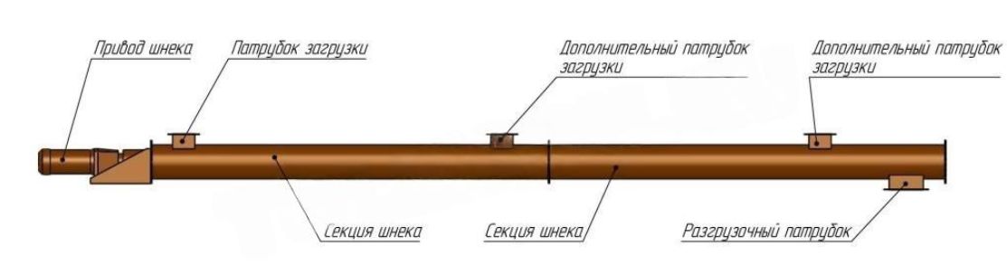 Транспортируемый материал поступает в загрузочную камеру шнека, откуда подхватывается вращающимся винтом с винтовыми лопастями. За счет вращения винта происходит перемещение материала лопастями в зону разгрузки. Откуда материал высыпается через разгрузочный фланец. Вращение винта осуществляется за счет работы привода шнека.