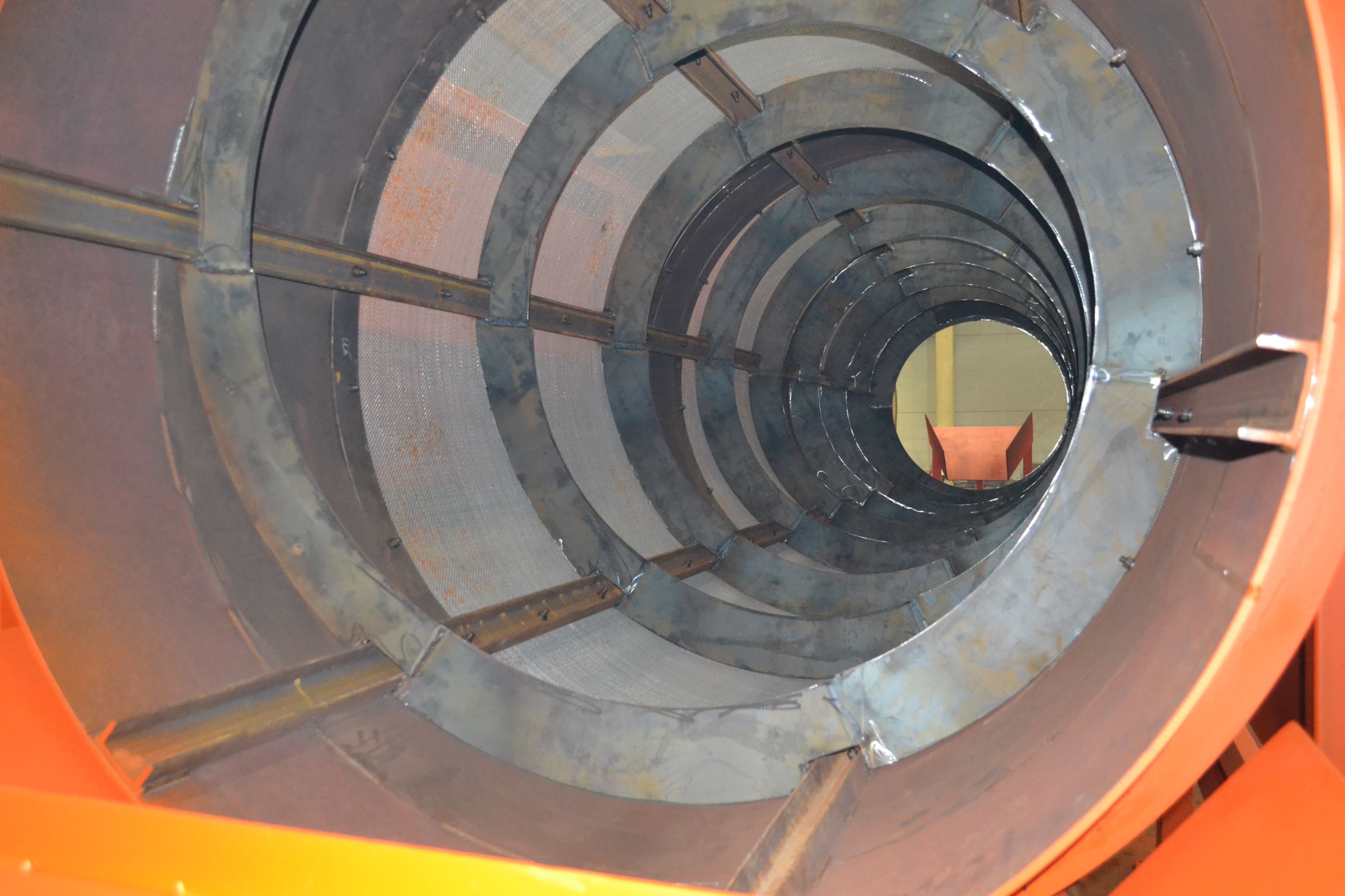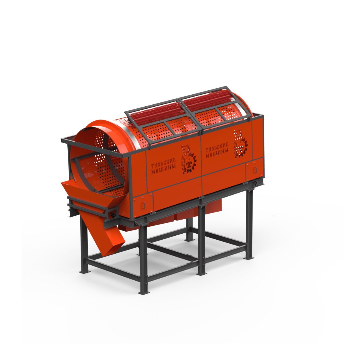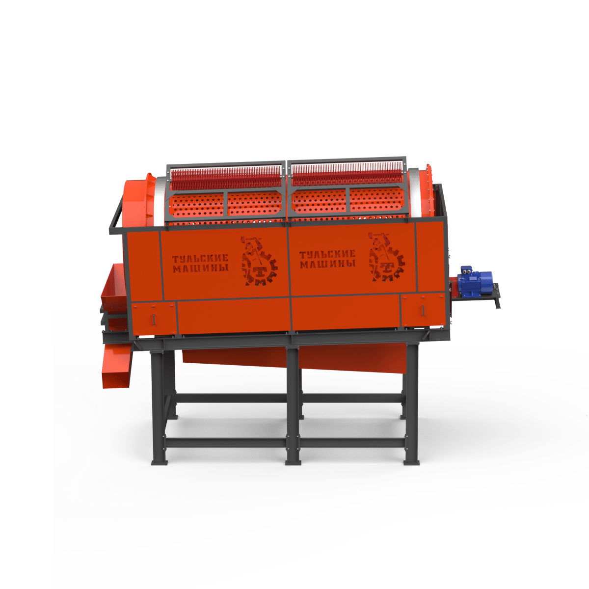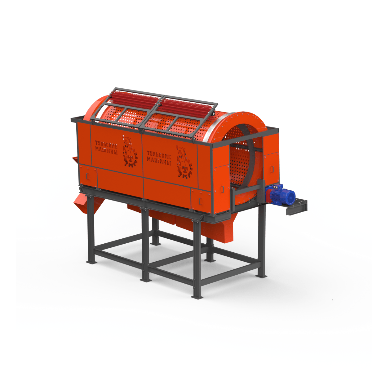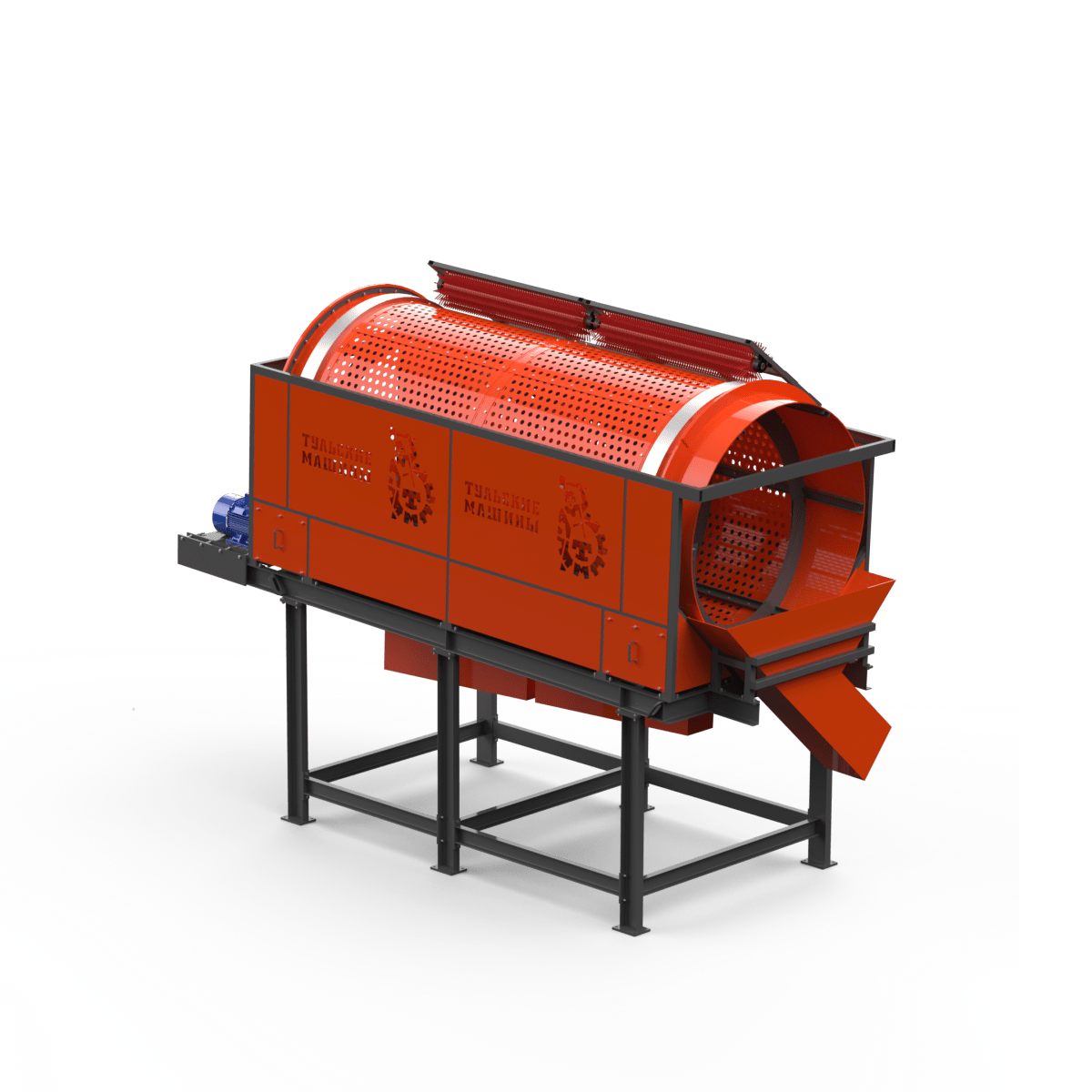 • Разделение: Мелкая фракция проходит сквозь отверстия сит, а крупные включения (надрешетный продукт) выходят через торцевое отверстие.