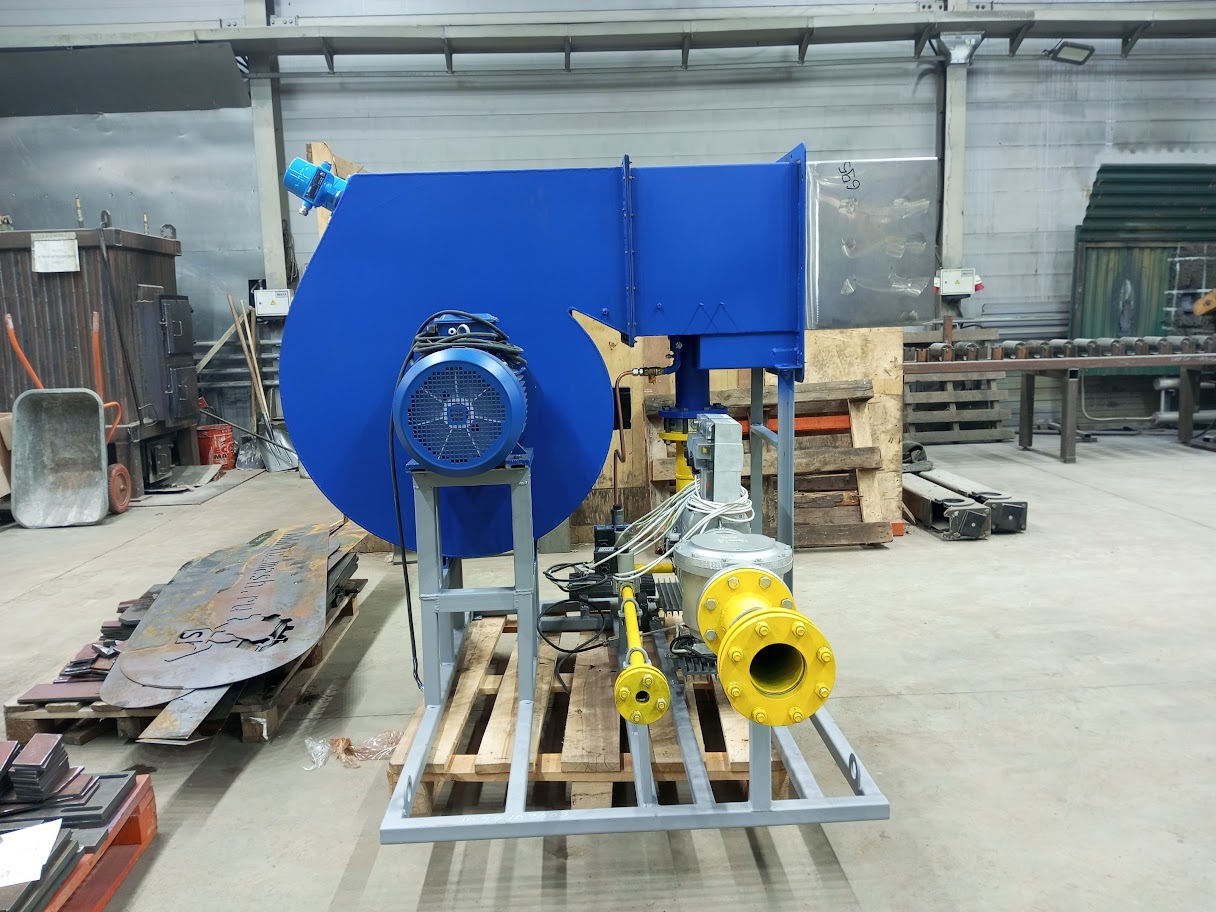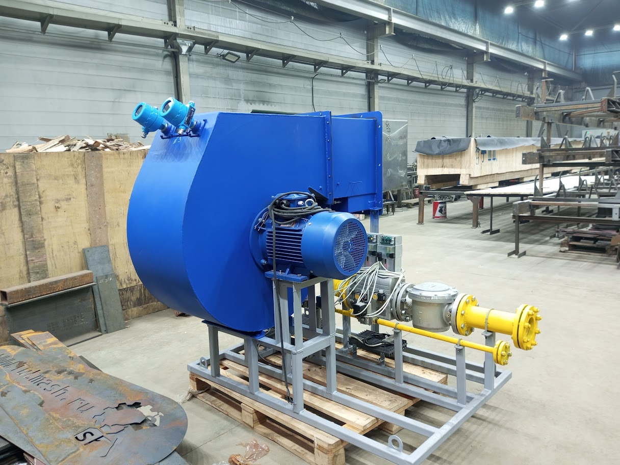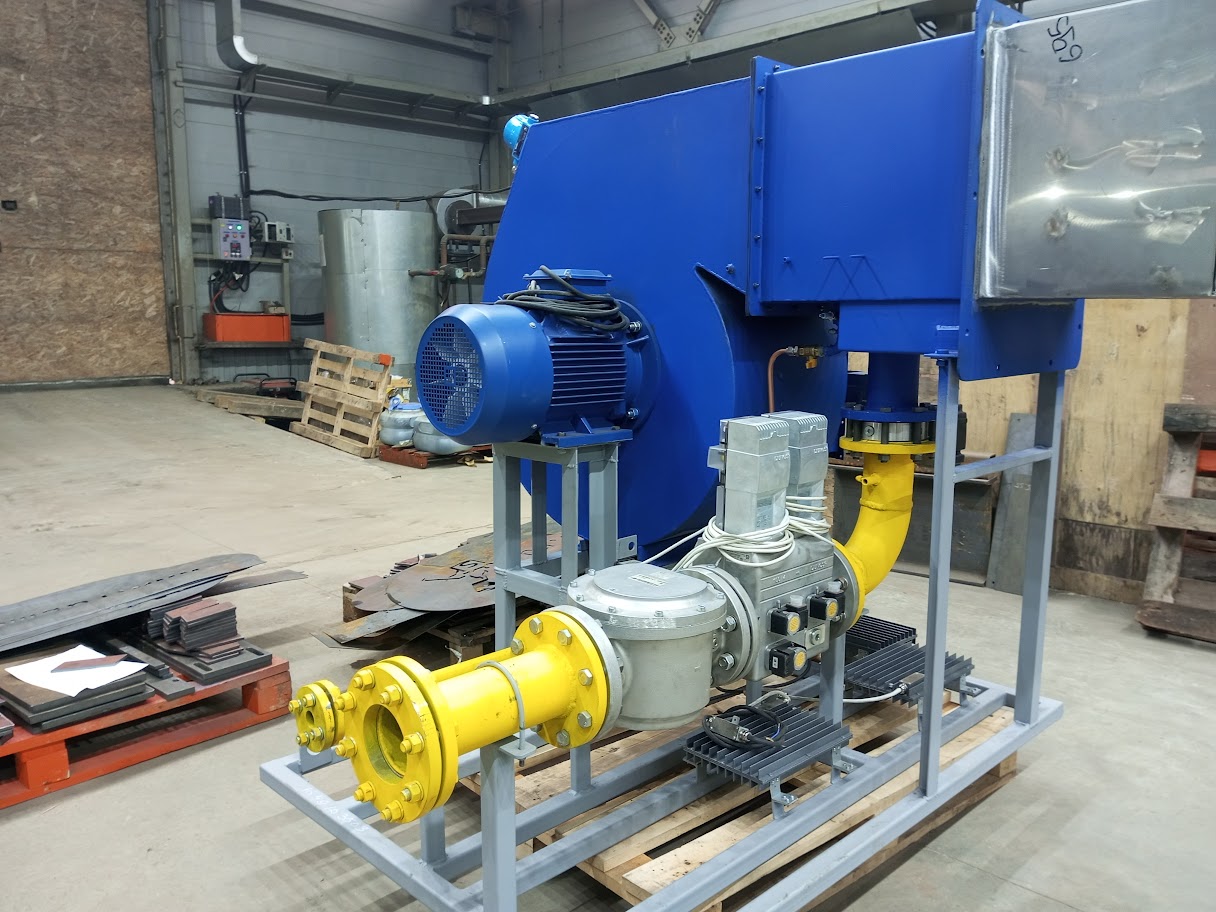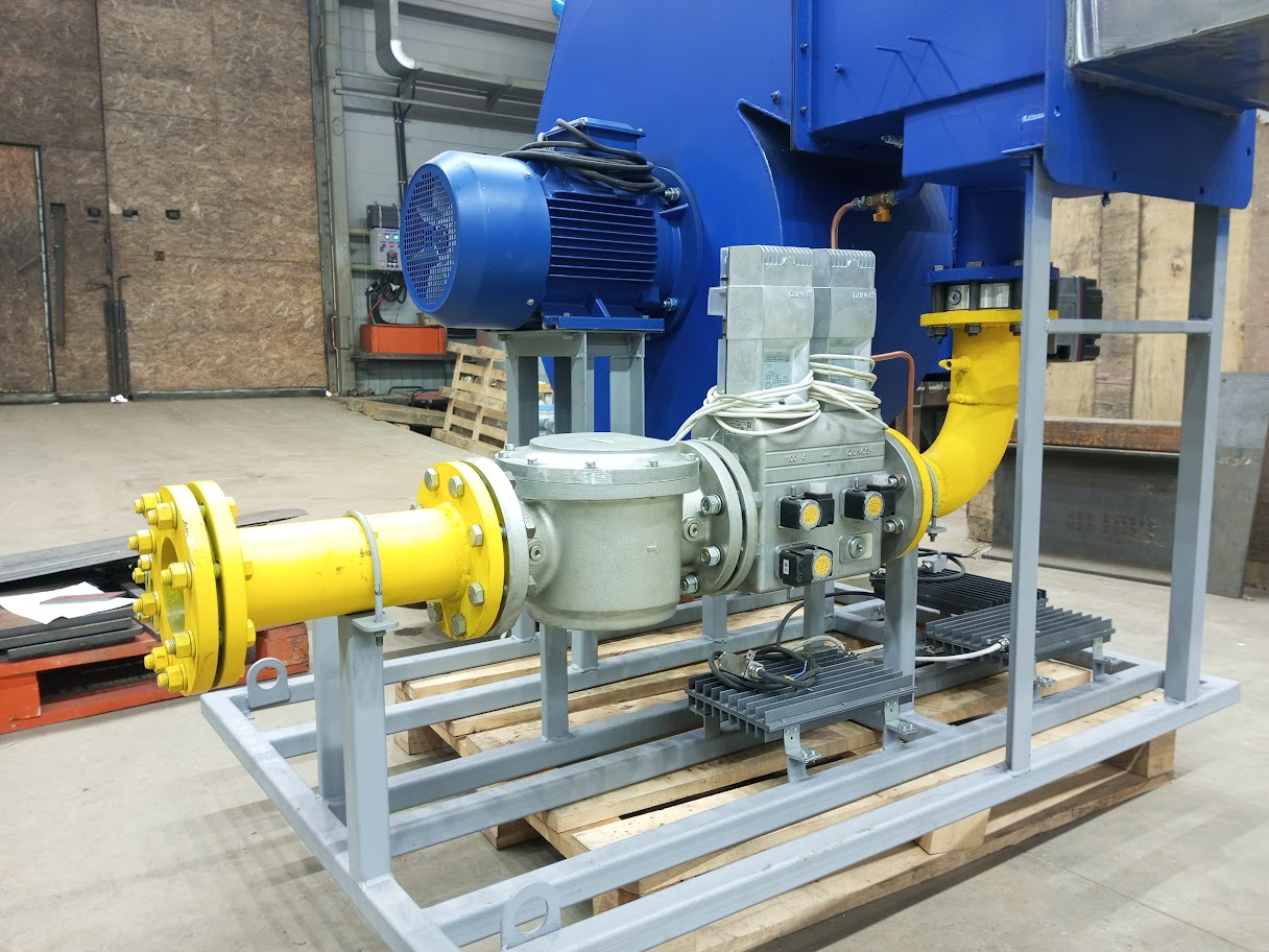 Газ через газовую арматуру поступает в газовый коллектор горелки, где происходит его распределение по пилонам. Воздух, нагнетаемый горелочным вентилятором 2, поступает в межпилонное пространство. На горелке предусмотрены ниппели для отбора импульсов давления газа и воздуха перед горелкой.