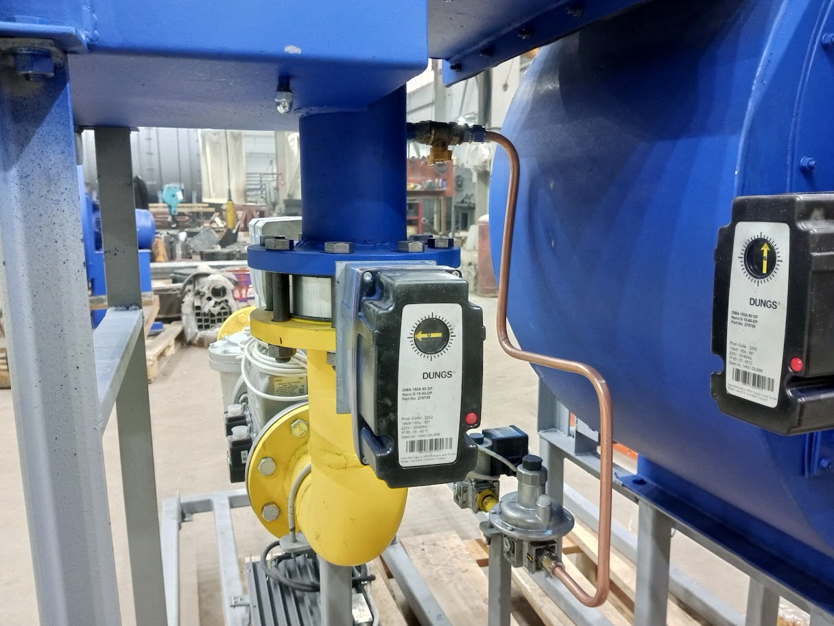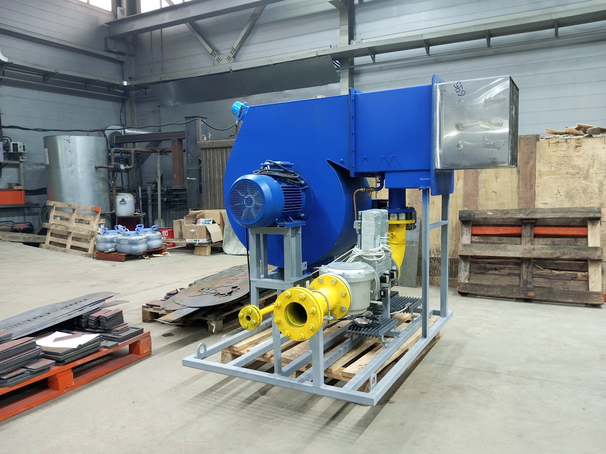 Горелка блочная состоит из горелки 1, дутьевого вентилятора 2, воздушной заслонки с приводом 3, газовой обвязки. В состав газовой обвязки входят фильтр 4, газовый мультиблок 5, газовая регулирующая заслонка 6, датчики давления газа 5.1, 5.2, 6.1, 6.2, клапан контроля герметичности 7, датчика контроля герметичности 8, клапан запальной горелки 9, стабилизатор давления газа запальной горелки, ручной кран расхода газа на запальник 10.