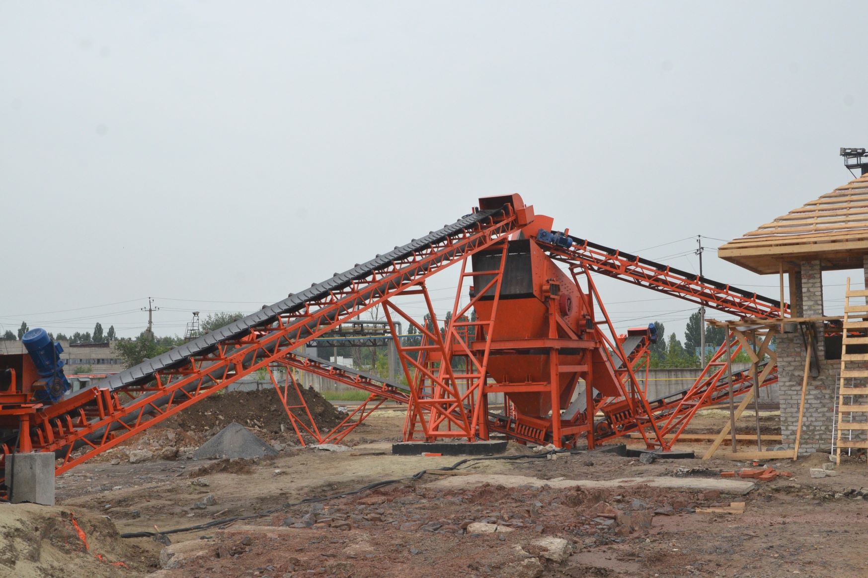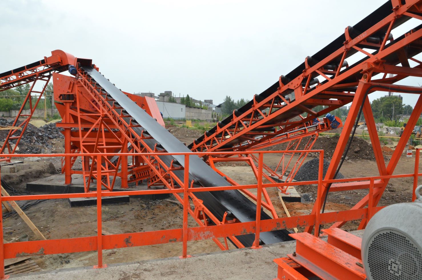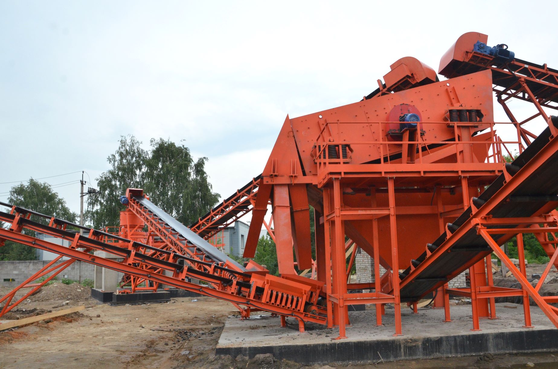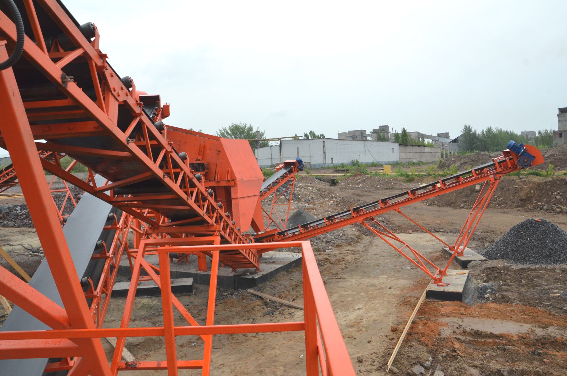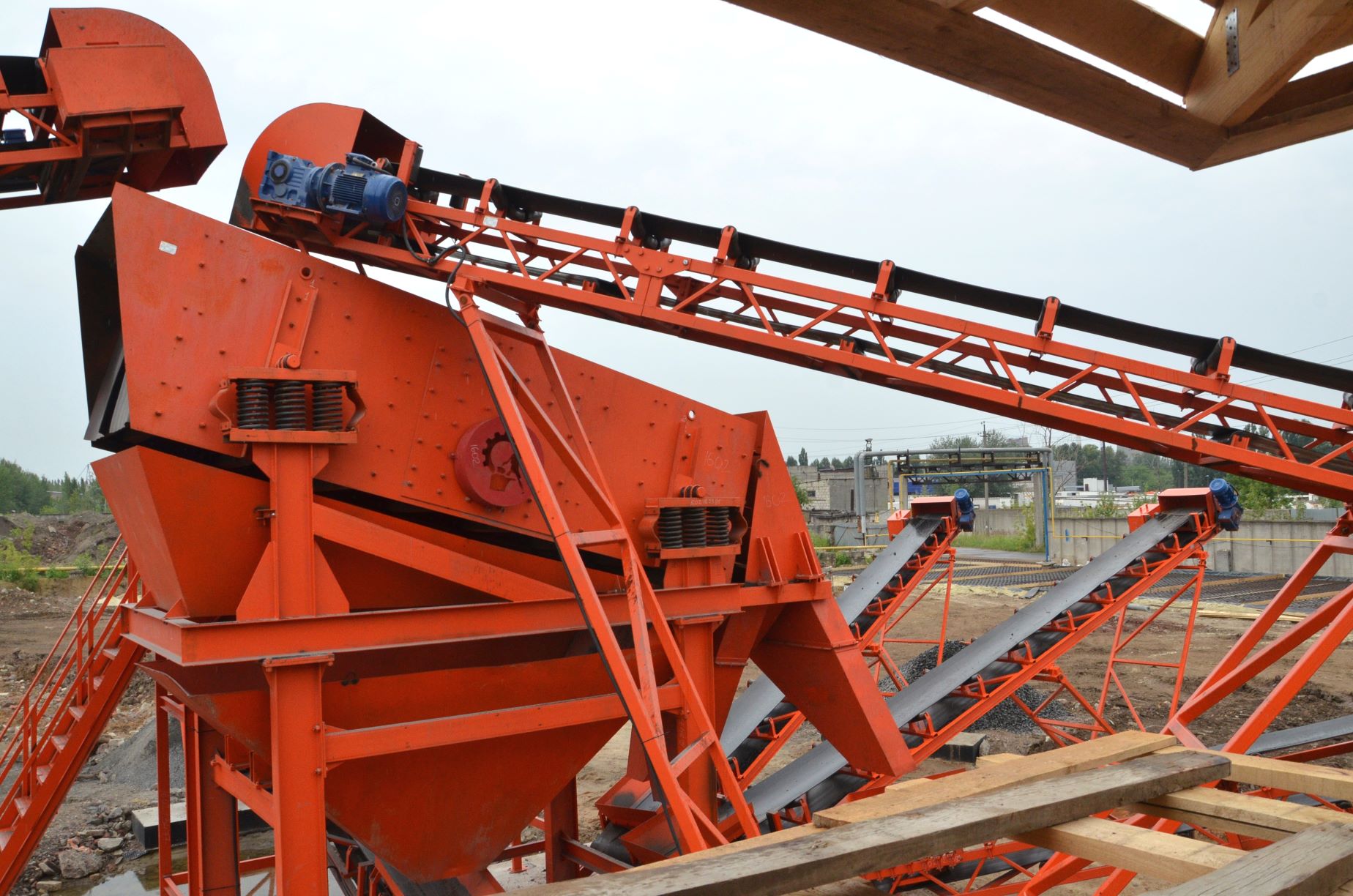Измельченный материал для товарной классификации подается с помощью двух параллельных ленточных конвейеров на инерционный грохот.