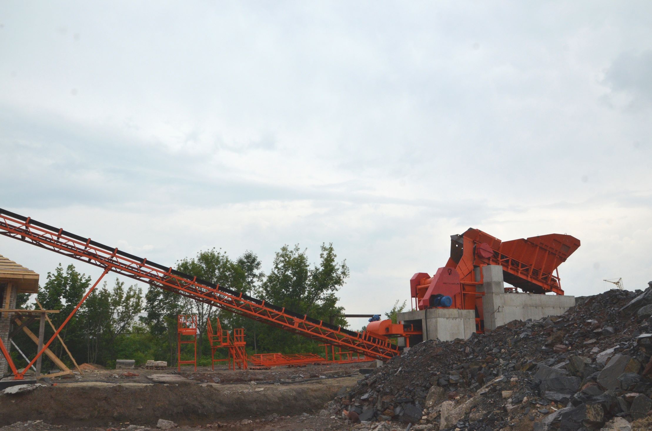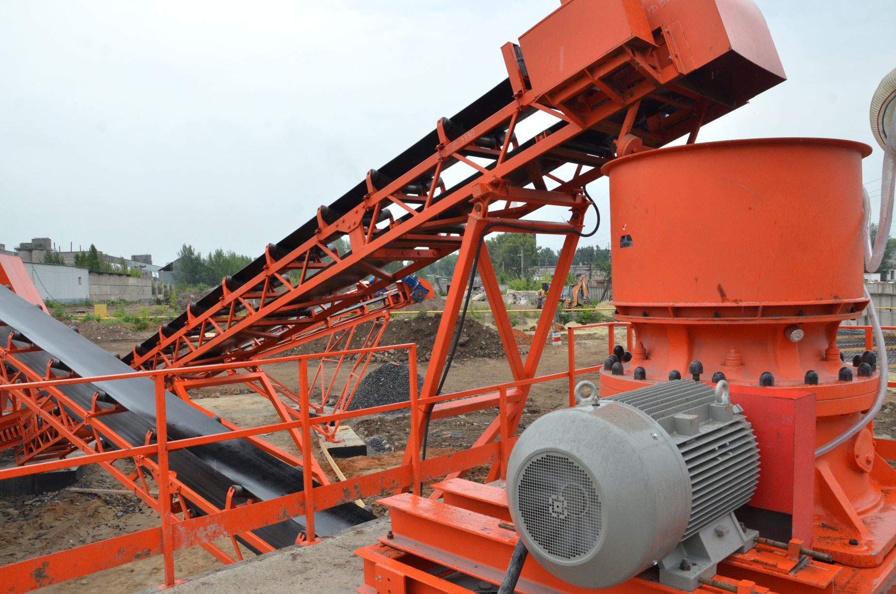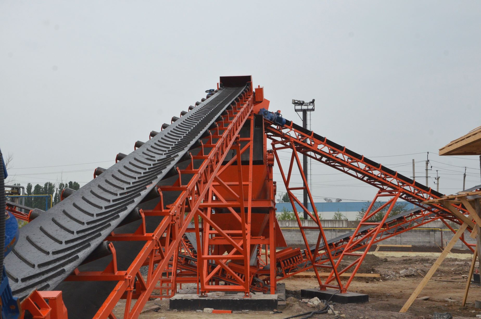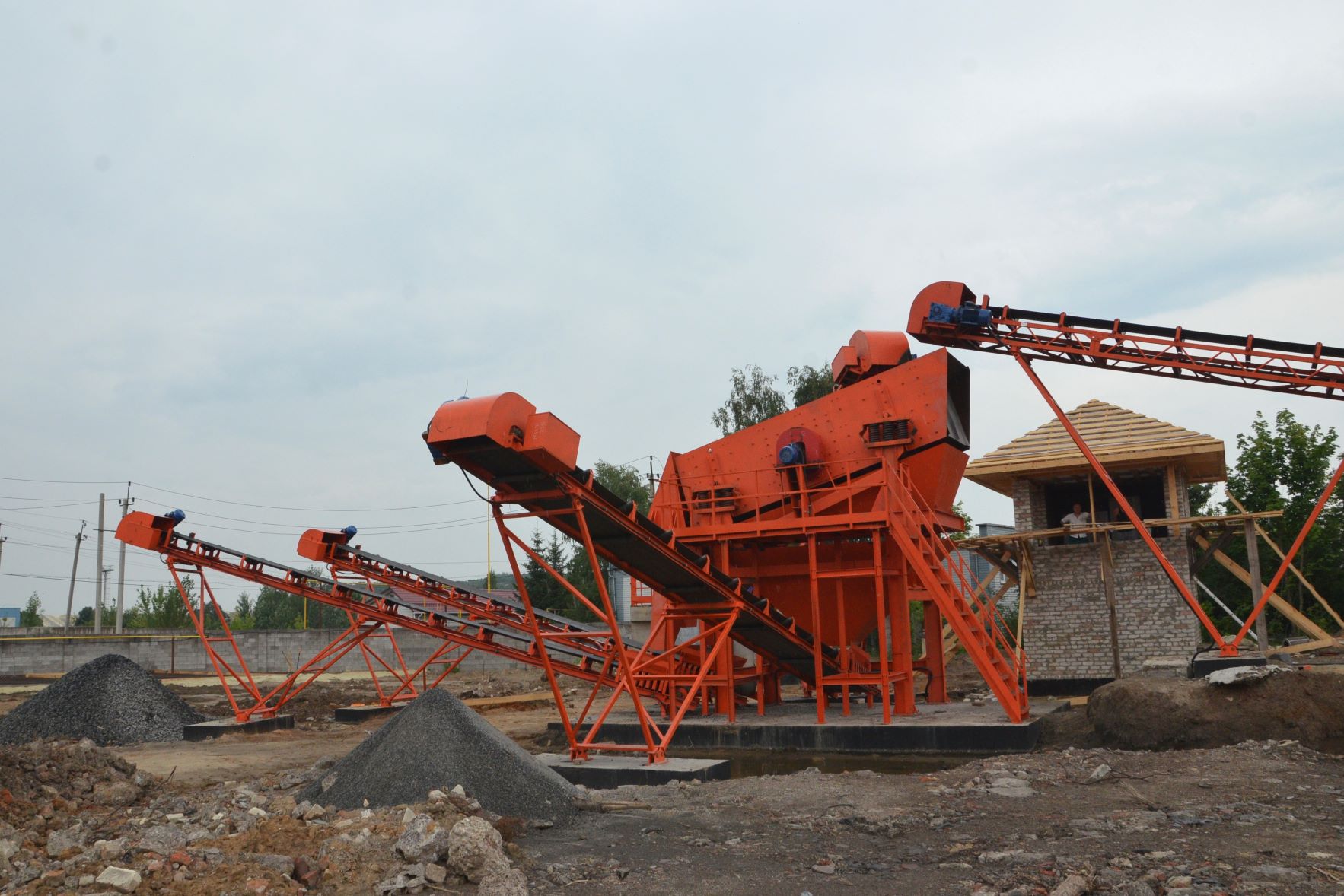 Измельченный материал для товарной классификации подается с помощью двух параллельных ленточных конвейеров на инерционный грохот.