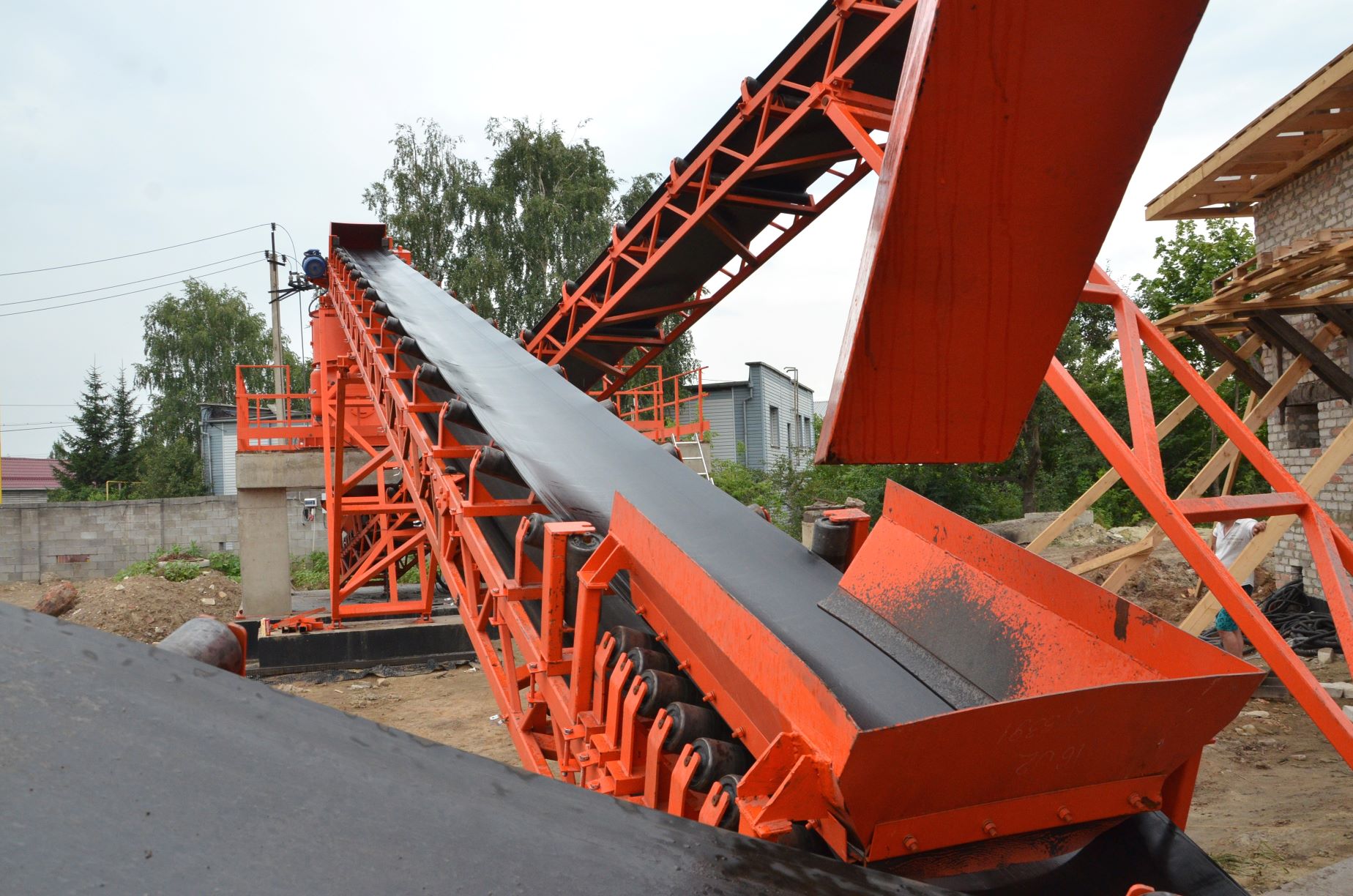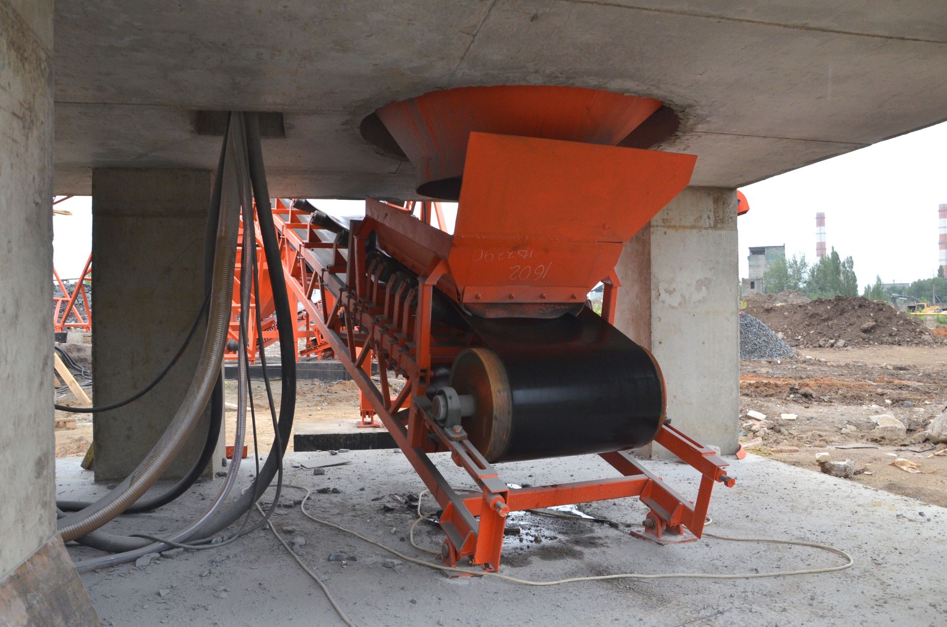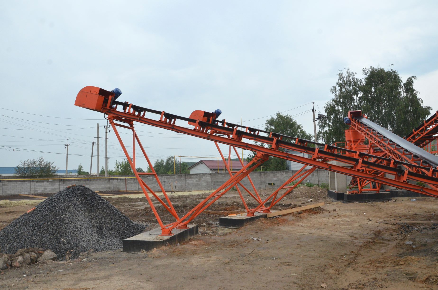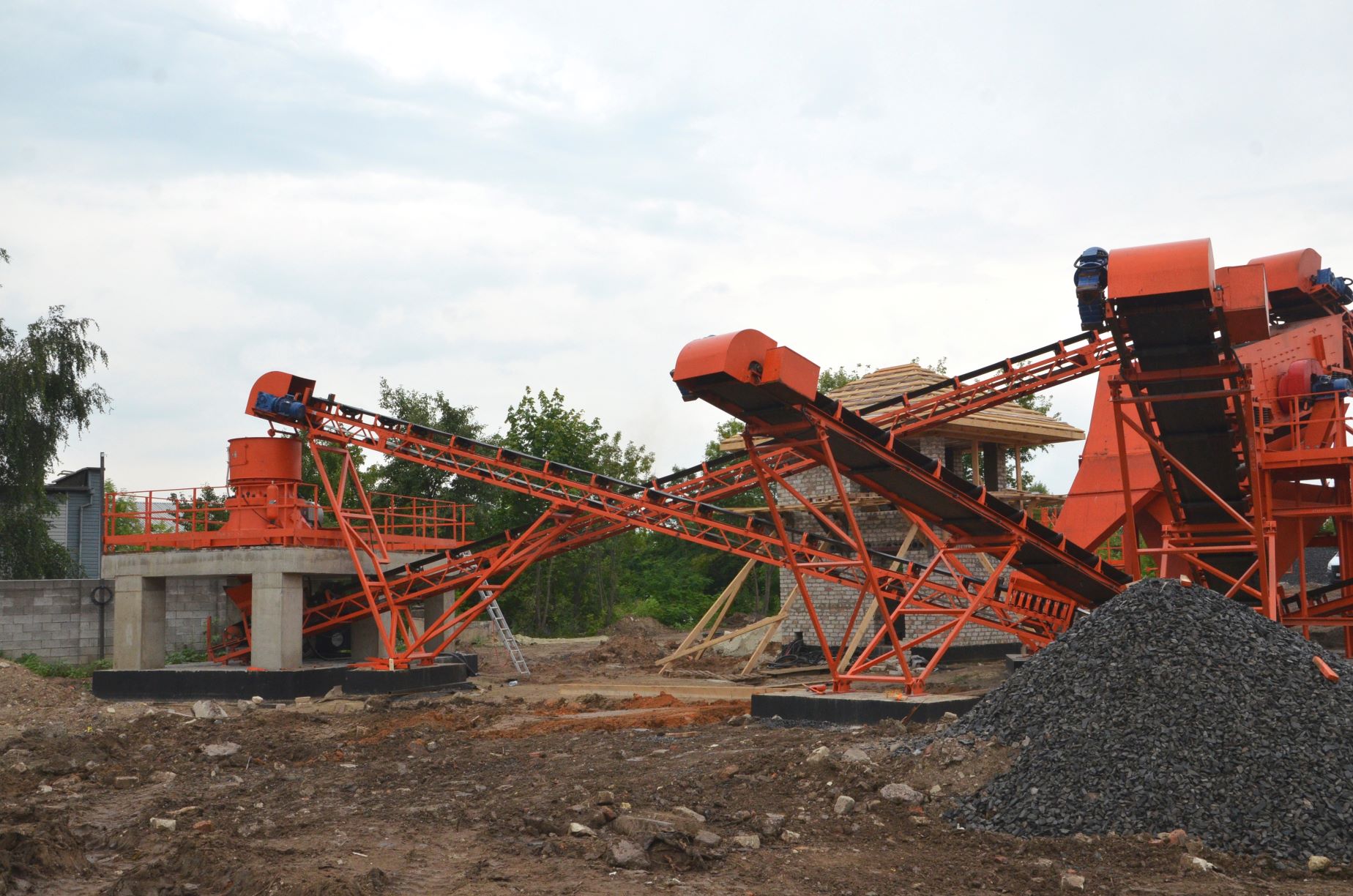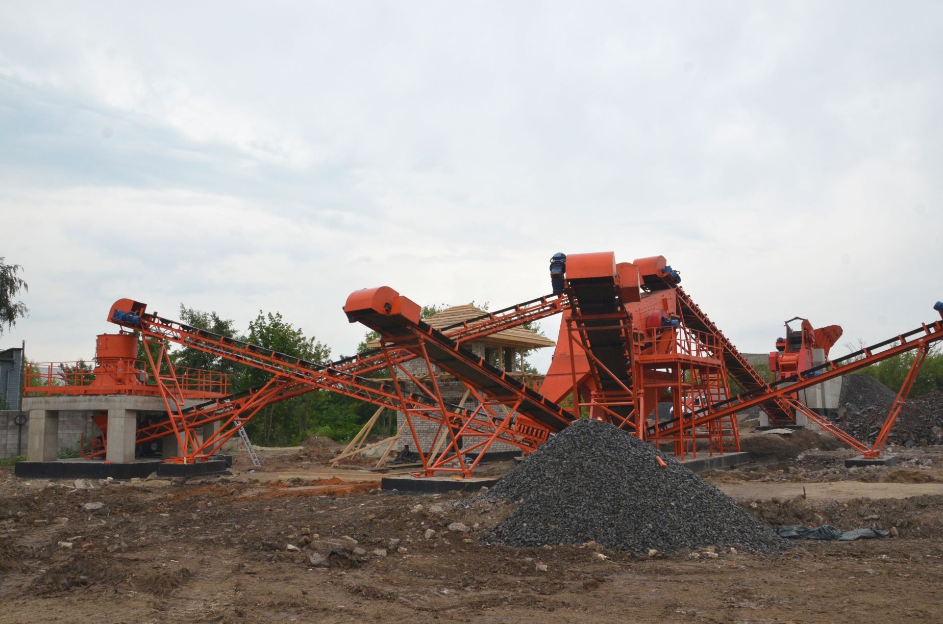 Измельченный материал для товарной классификации подается с помощью двух параллельных ленточных конвейеров на инерционный грохот.