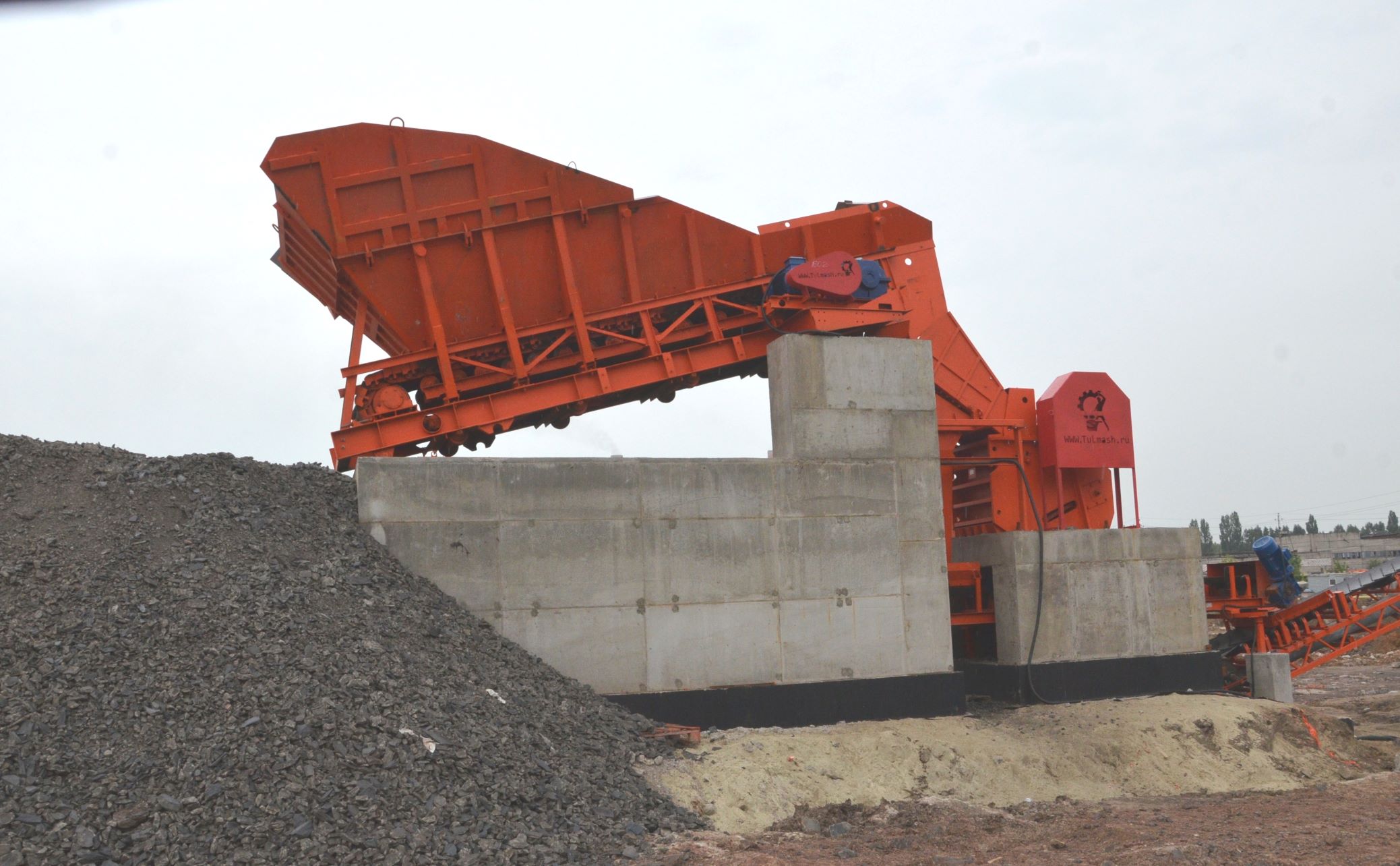 Загрузка исходного материала осуществляется в приемный бункер с помощью ковшового погрузчика с объемом ковша не более 3м³. Равномерность подачи материала обеспечивается работой промышленных вибраторов, прикрепленных к корпусу бункеров.