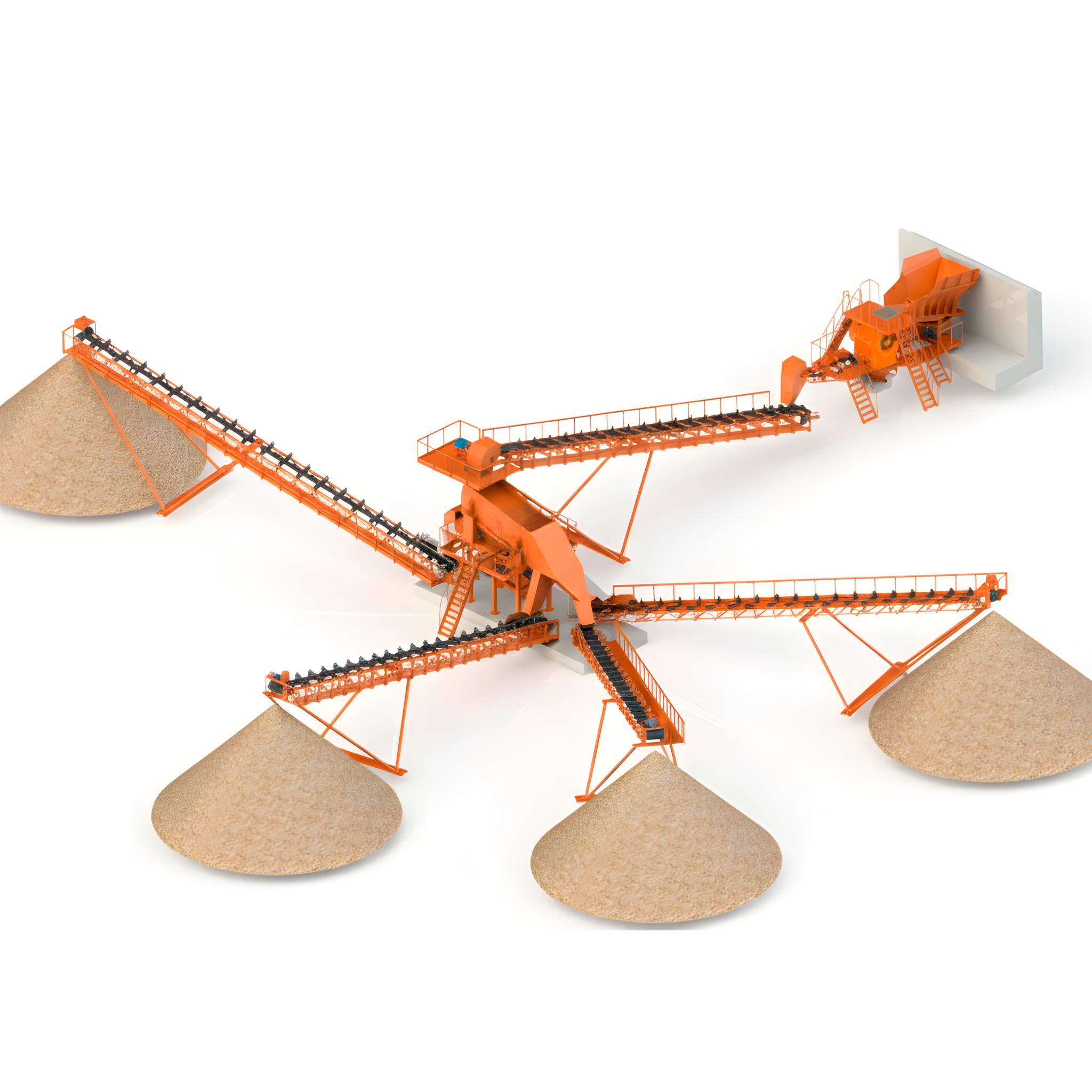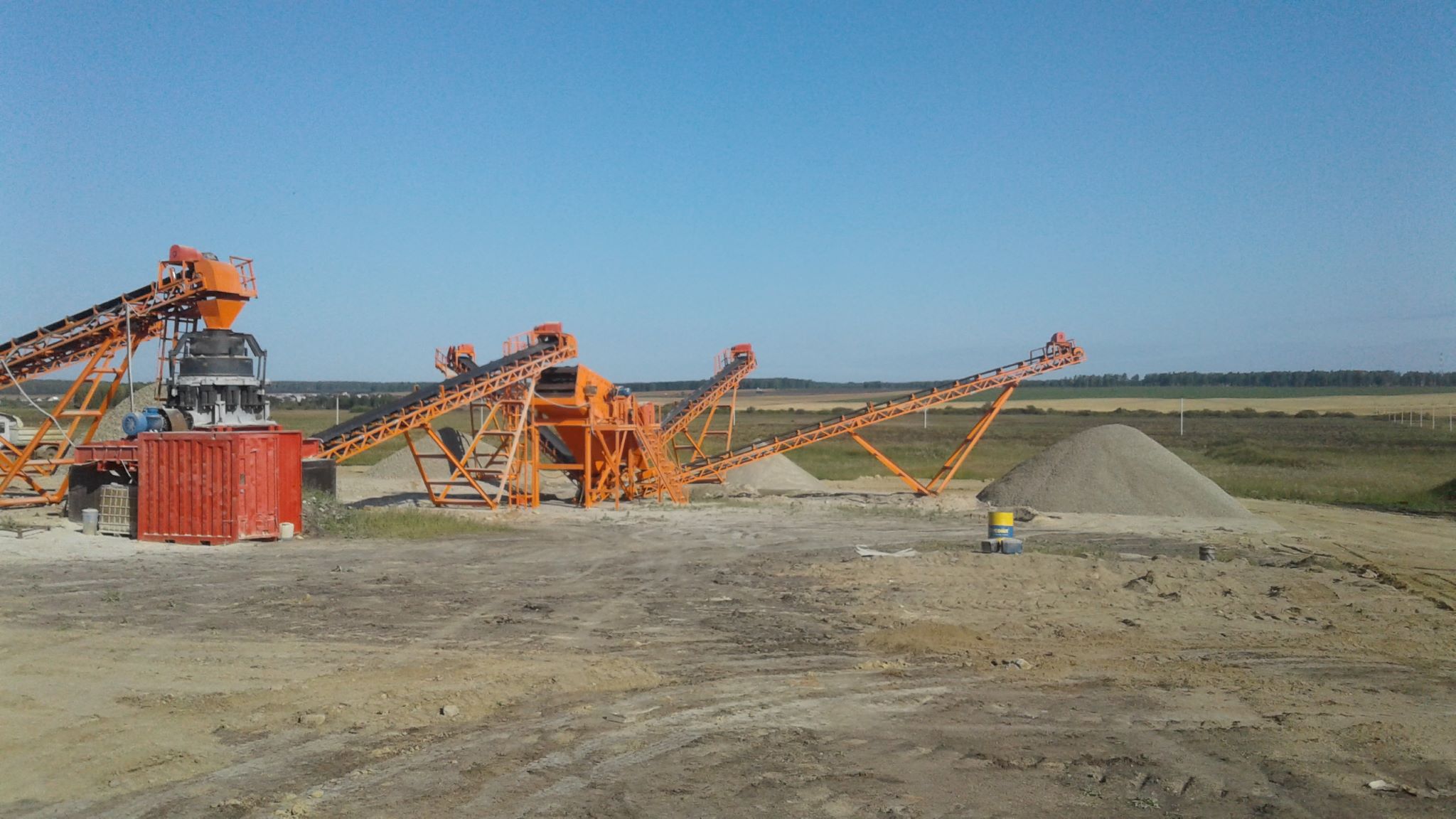 Из приемного бункера пластинчатый питатель осуществляет равномерную подачу твердых пород в щековую дробилку первой стадии СДС6/9. Там происходит первичное разрушение материала, и перемещение его на ленточный конвейер. Вторая стадия дробления осуществляется в конусной дробилке КД-1200, откуда материал по ленточному конвейеру поступает на товарную сортировку в инерционном грохоте ГИС-53. Продукция и отсев дробления отгружаются в конуса при помощи конвейеров (ширина ленты 800 мм, длина 20м, угол установки до 17 градусов).