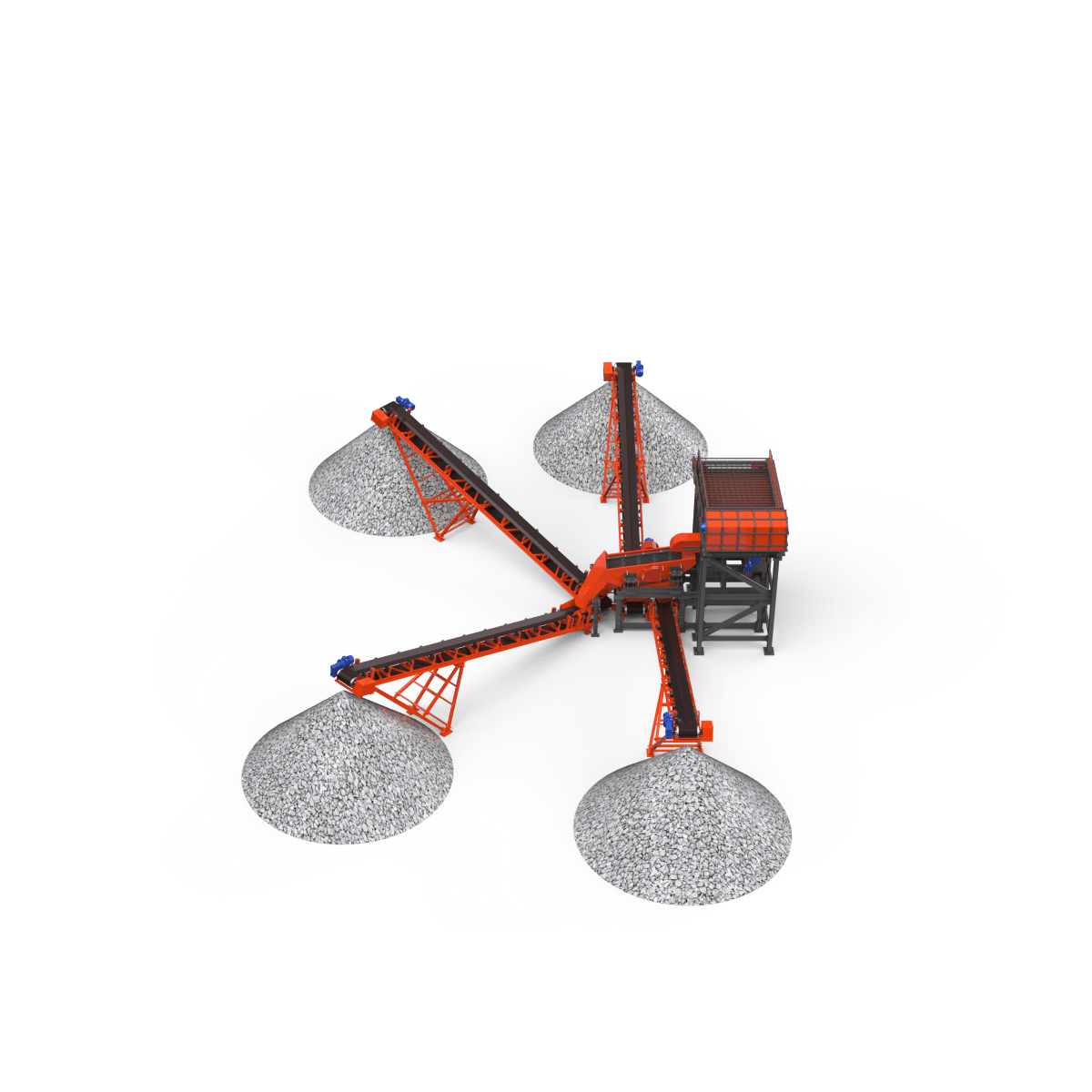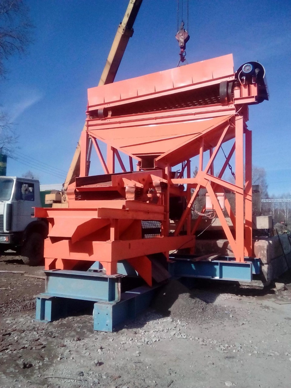 Материал, прошедший через отверстия первого сита, аналогичным образом рассеивается на следующем сите на два класса по крупности. Самый крупный материал попадает в приемную емкость (течку), расположенную под выгрузным отверстием грохота. Выгрузка материала с сит осуществляется воронками. Форма и размер приемного бункера зависит от условий эксплуатации, физико-механических свойств загружаемого материала и желания Заказчика.