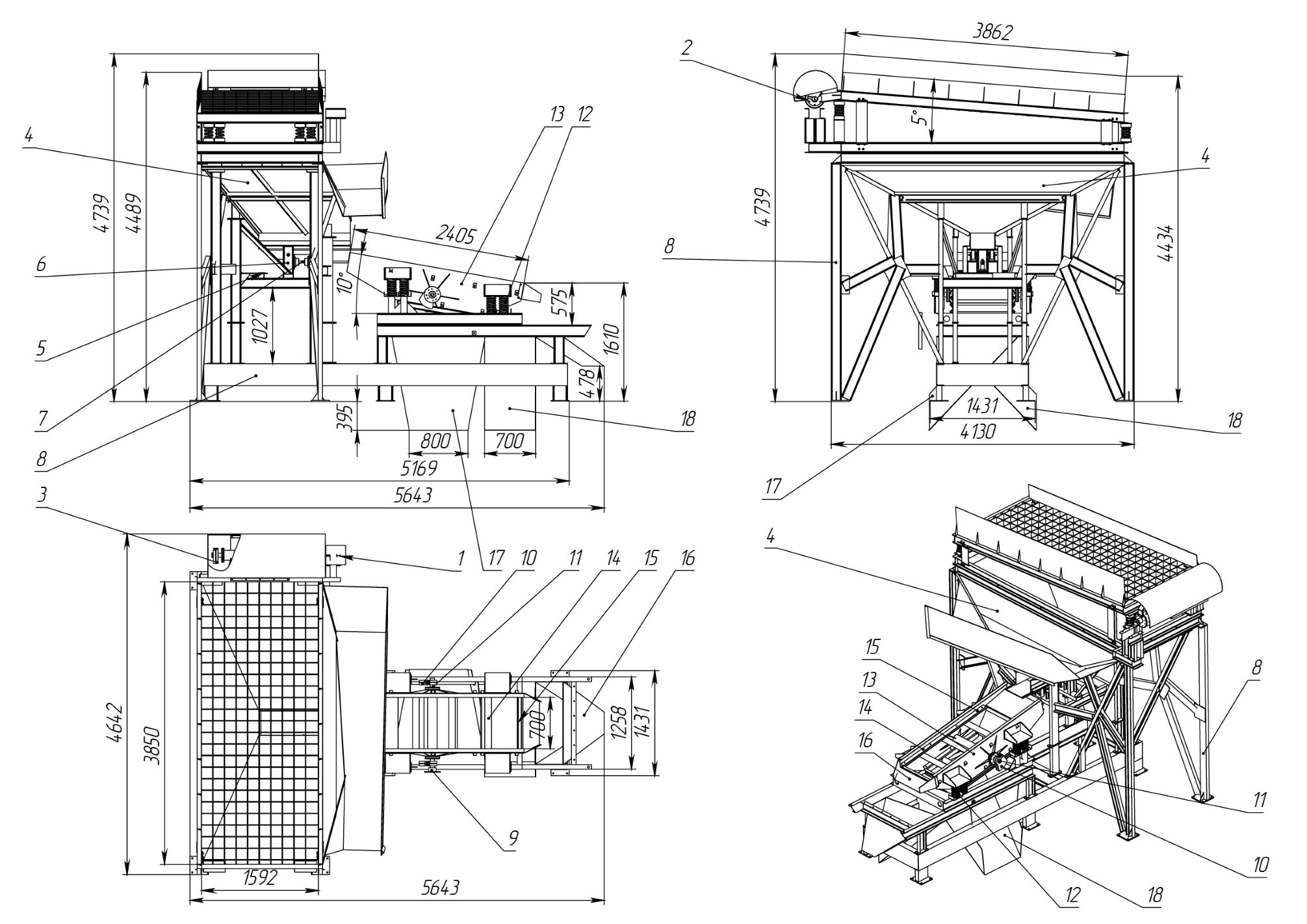 Материал из бункера равномерно подается для дальнейшей сортировки на инерционном грохоте с помощью лоткового питателя (поз.3), представляющего собой подвижной лоток с приводом и кривошипно-шатунным механизмом. Материал попадает на подвижную тележку, совершающую возвратно-поступательные движения и за счет ее колебания, движется в зону выгрузки на инерционный грохот (поз.4). Питатель крепится на общую раму (поз.5), на которой устанавливается бункер и грохот.