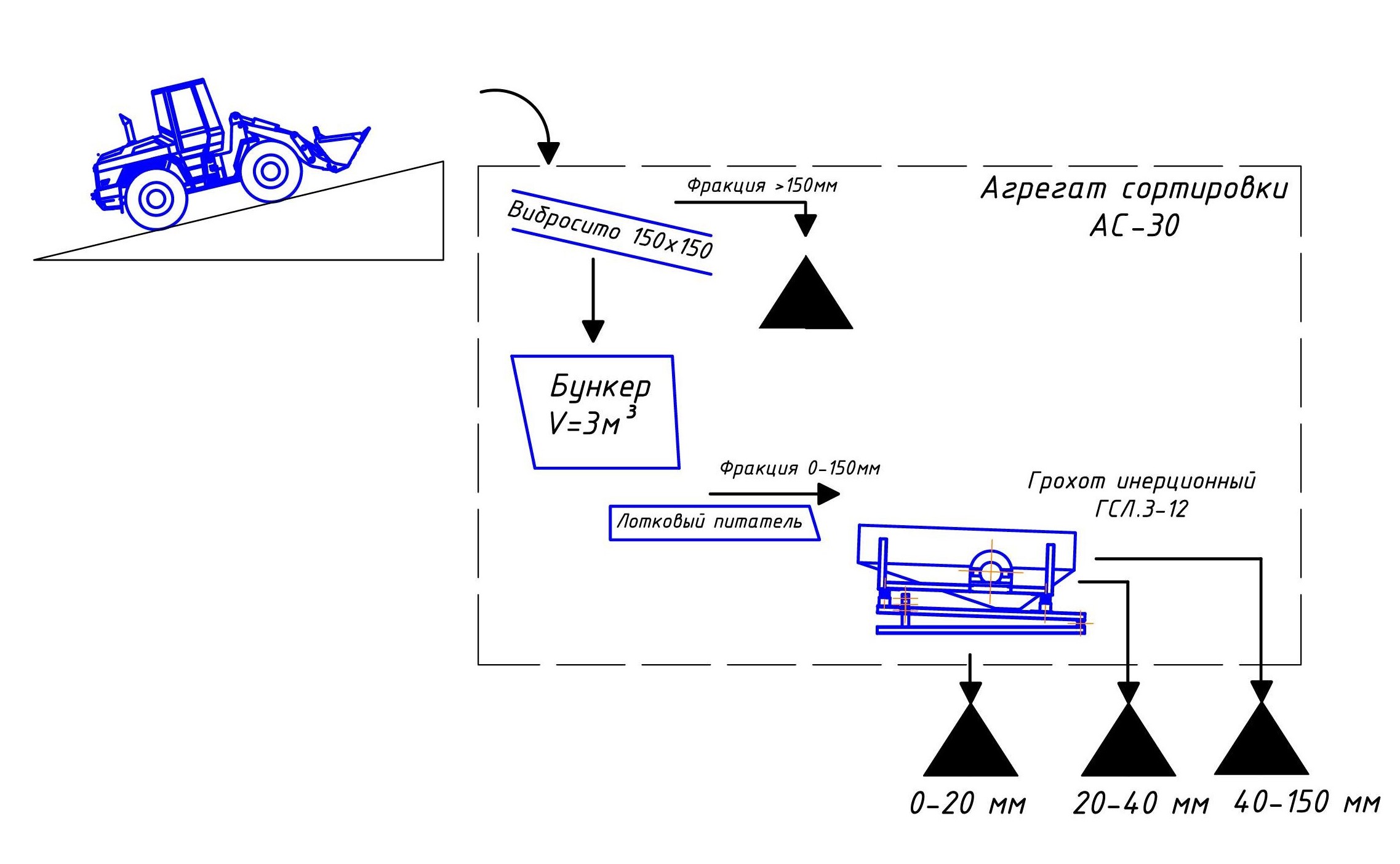 Загрузка агрегата АС-30 может осуществляется как фронтальным погрузчиком, так и автотранспортом с пандуса. Загружаемый материал попадает на вибросито (поз.1). За счет возвратно-поступательного движения виброрешетки часть материала с размерами фракций больше чем размер ячеек сита сбрасывается с решетки по наклонным лоткам. Материал, размеры которого меньше размера сит, просыпается в приемный бункер (поз.2).