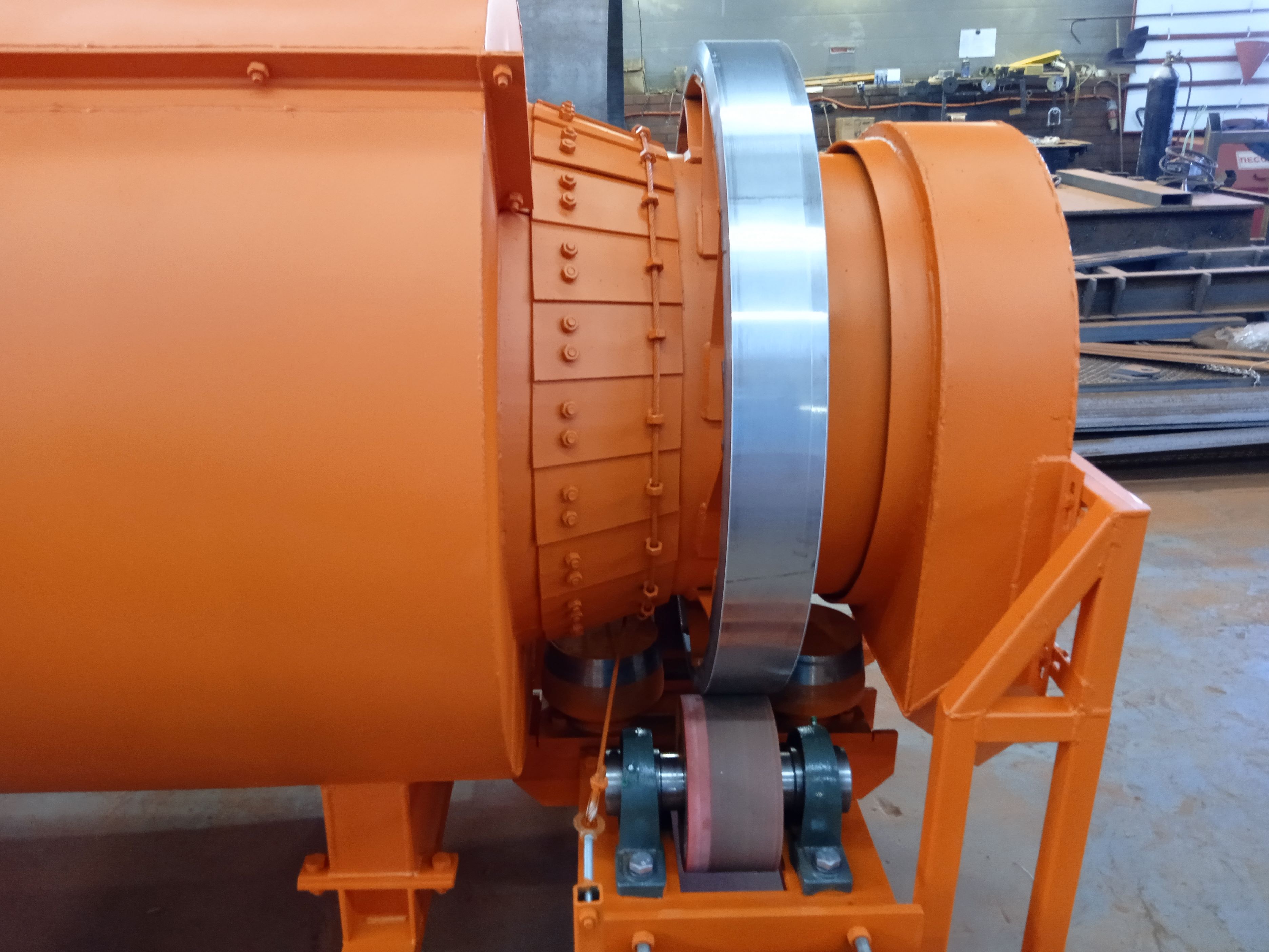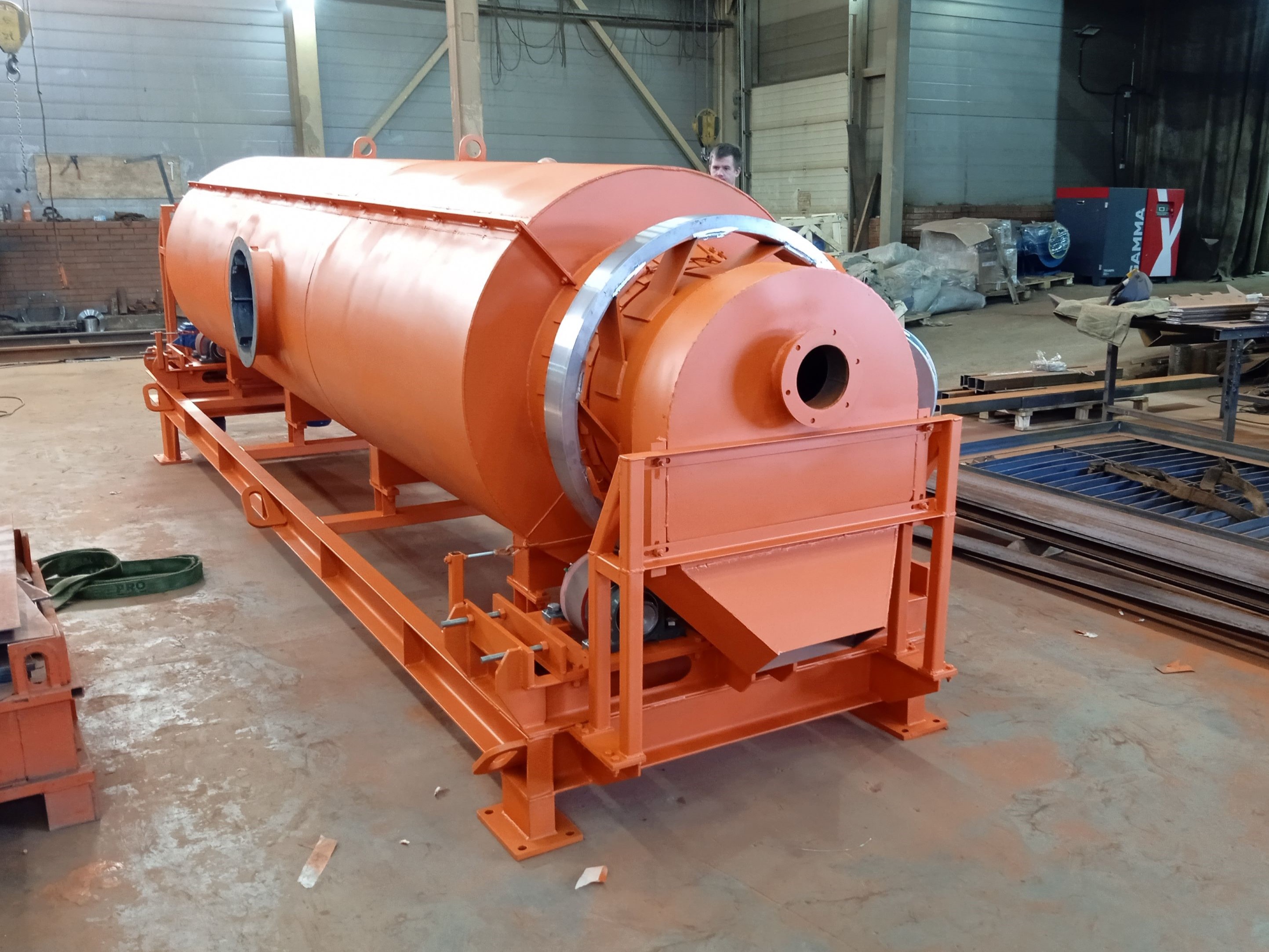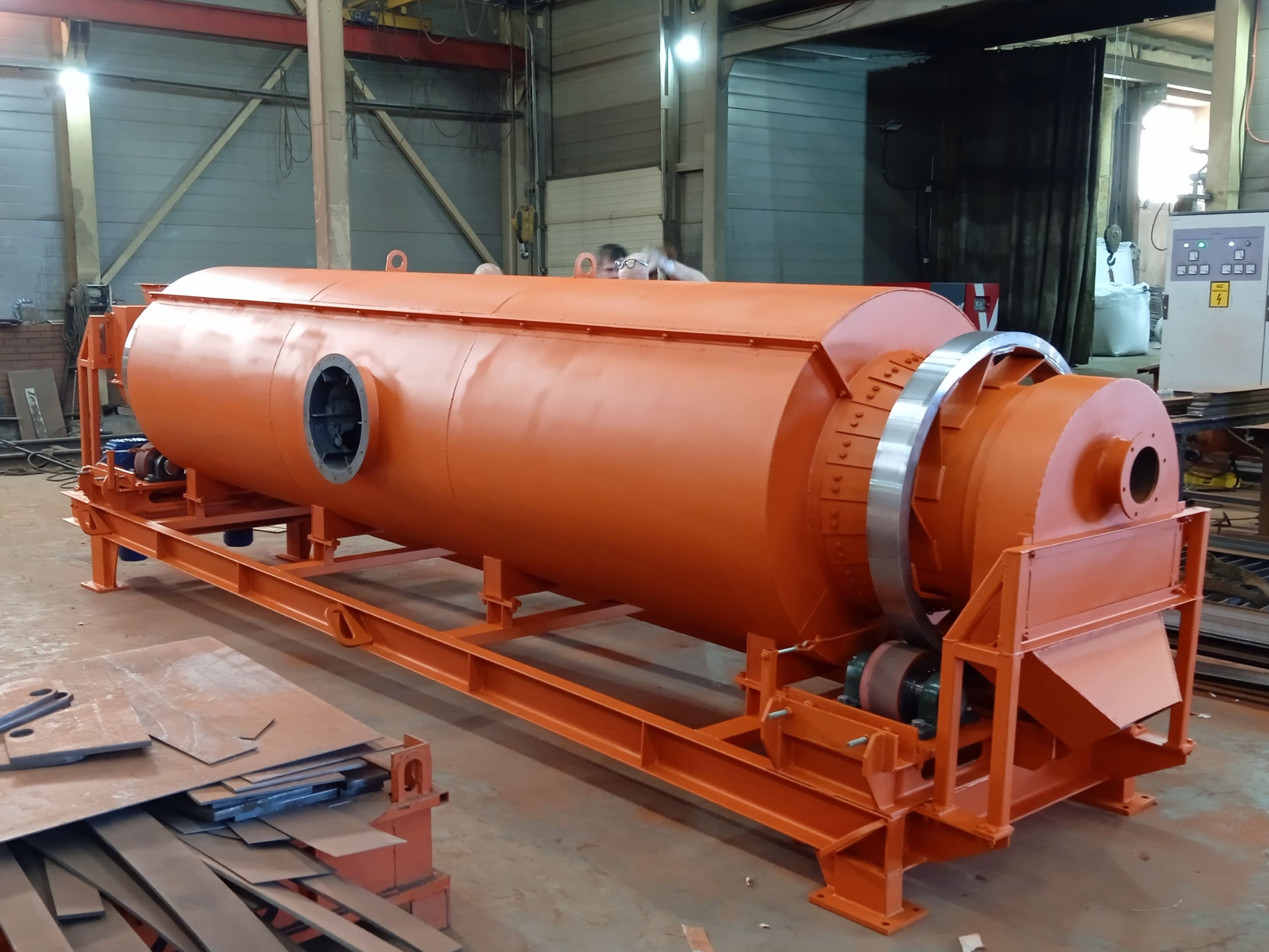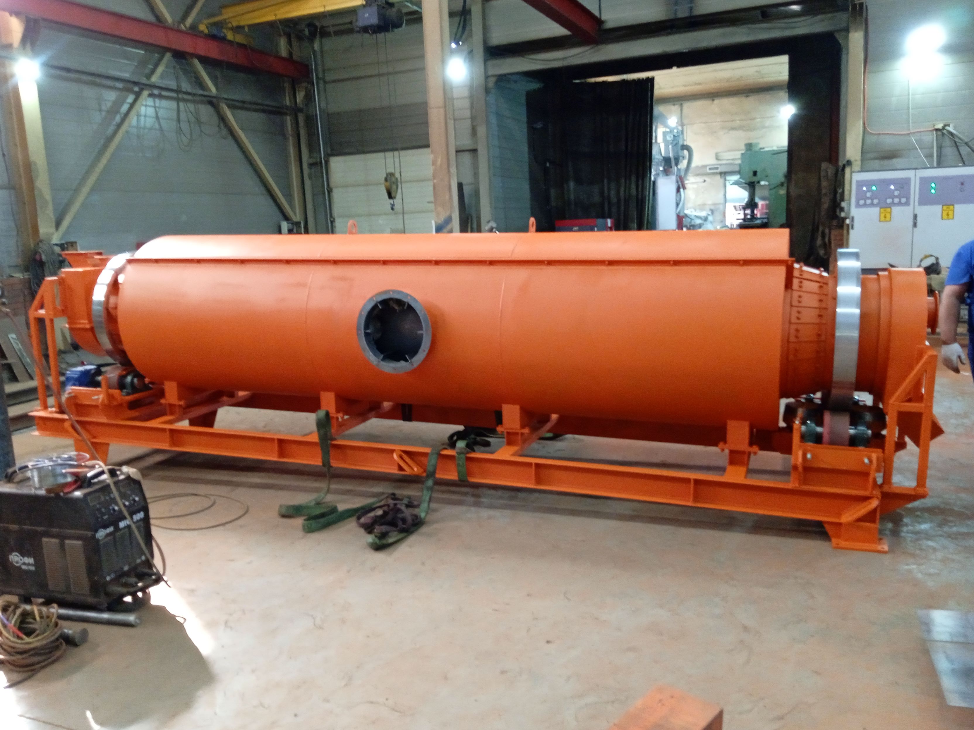 Корпус печи косвенного нагрева представляет собой внутренний корпус 1 (реторту) диаметром 630мм, сваренную из отдельных обечаек. К трубе приварены опорные бандажи 2, обеспечивающие опору и вращение печи на двух группах опорных роликов 3. Приводные ролики 4, обеспечивающие передачу крутящего момента от приводного устройства 5 . Винтовая насадка 7 в зоне загрузки позволяет подавать материал в зону с лопастными насадками (лопатками) 6 для эффективной сушки материала из загрузочного устройства 8.