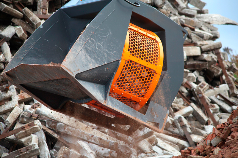 Благодаря вращающемуся барабану с просеивающей сеткой материал равномерно перемешивается и просеивается. Такая технология значительно снижает вероятность забивания отверстий, даже при работе с влажными или липкими материалами. Это делает роторный ковш идеальным решением для работы в карьерах, на строительных площадках, при дорожных работах и переработке грунта.