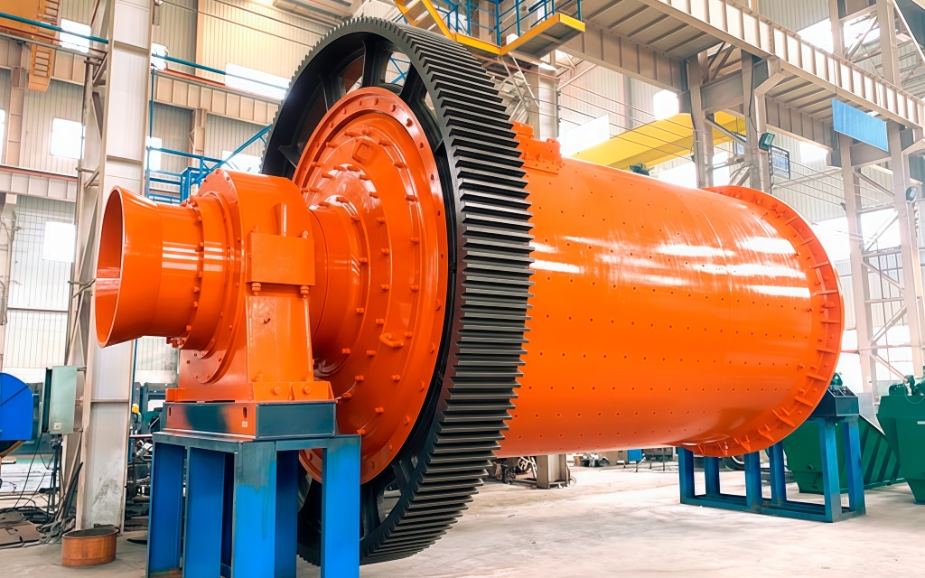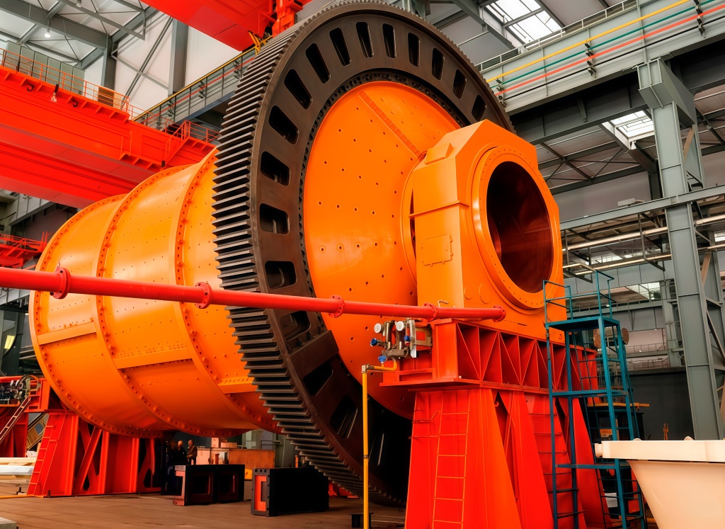 Основной узел — вращающийся барабан, частично заполненный помольными телами (стальные/чугунные/керамические шары). При вращении происходит ударное дробление и истирание материала между шарами и о футеровку. Загрузка и разгрузка осуществляется через центральные торцевые отверстия. Профиль футеровки и скорость вращения подбираются под требуемую крупность помола и свойства сырья.