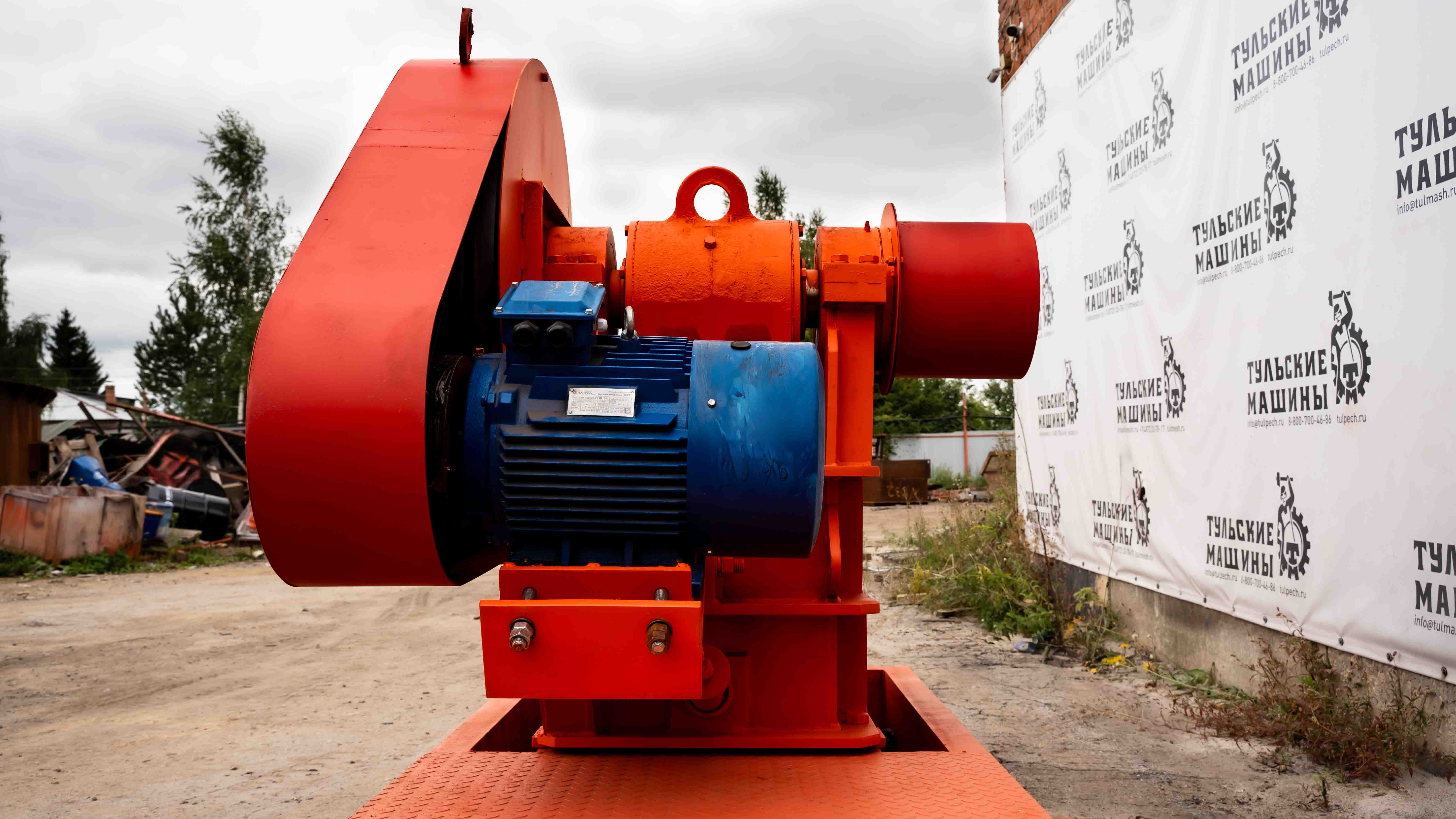 Дробилка состоит из корпуса, на котором смонтирована подвижная щека с двигающейся дробящей плитой, валом и подшипниками. На передней стенке корпуса закреплена неподвижная дробящая плита.