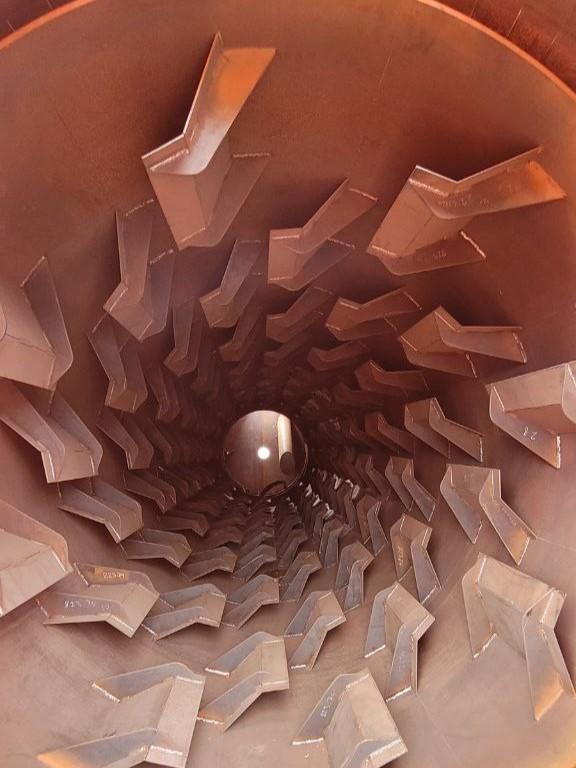 Корпус сушильного барабана представляет собой корпус 1 (трубу) диаметром 1850мм, сваренную из отдельных обечаек. К трубе приварены опорные бандажи 2, обеспечивающие опору и вращение печи на двух группах опорных роликов 3. Венец 4, обеспечивающий передачу крутящего момента от приводного устройства 5 через цепь. Винтовая насадка 7 в зоне загрузки позволяет подавать материал в зону с лопастными насадками (лопатками) 6 для эффективной сушки материала, из загрузочного устройства 8.