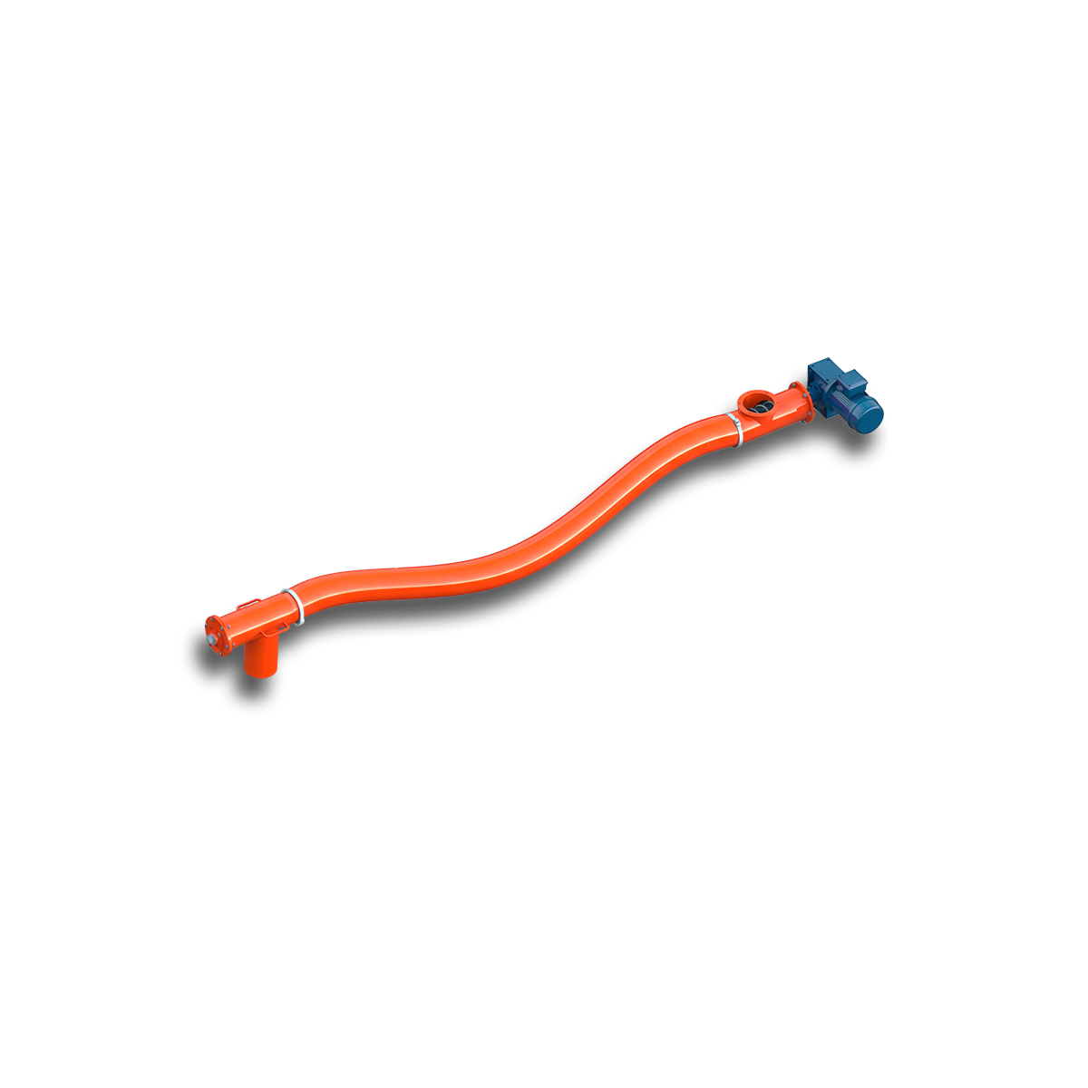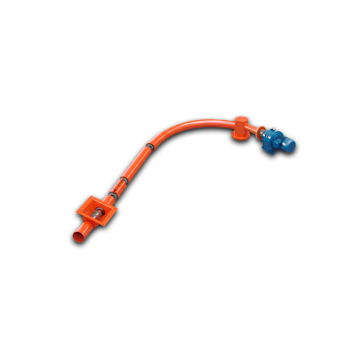 Гибкий шнек состоит из модуля загрузки материала, гибкой спирали в корпусе, разгрузочного модуля и приводной станции с электродвигателем и редуктором. При необходимости гибкий шнек может быть выполнен в комплектации с расходным бункером в зоне загрузки или специальным патрубком в зоне выгрузки. Подающая спираль гибкого шнека выполняется из углеродистой и нержавеющей стали, она должна быть гибкой для придания необходимой формы, иметь высокую износостойкость. Спираль гибкого шнека никогда не выполняется сварной. Концы подающей спирали крепятся в подшипниковых опорах, одна из которых устанавливается на валу приводной станции, а другая – в районе разгрузочного модуля. При включении электропривода спираль вращается и перемещает попавший в межвитковое пространство материал вдоль гибкого корпуса к разгрузочному модулю. Корпус спирального конвейера представляет собой трубу, выполненную из устойчивого к абразивному износу полимерного материала. Дополнительная защита корпуса от износа осуществляется при помощи оригинального технического решения: тщательно выверенный кольцевой зазор между внутренними стенками корпуса и спиралью оказывается постоянно заполненным транспортируемым материалом, который служит своеобразным щитом, предохраняющим корпус от износа. Для обеспечения герметичности корпуса в местах его крепления к загрузочному и разгрузочному модулям предусмотрены специальные уплотнительные элементы, которые могут располагаться в одном корпусе с подшипниковыми опорами, а могут быть от них изолированы.