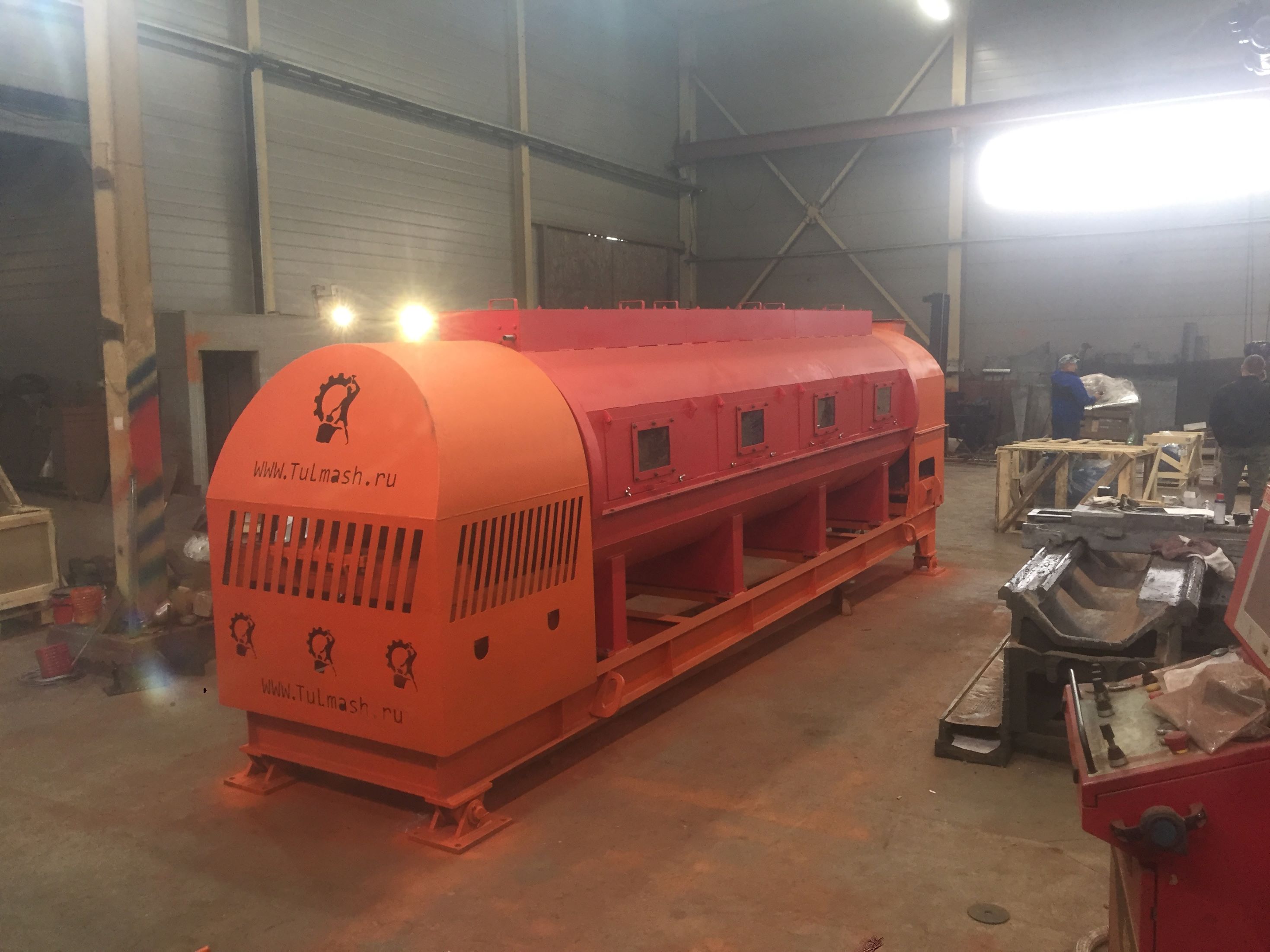 Материал, подлежащий охлаждению, загружается во вращающийся барабан, который установлен внутри колбы охлаждения на опорных роликах. Вращение на барабан передается через 2 приводных ролика от электродвигателей.