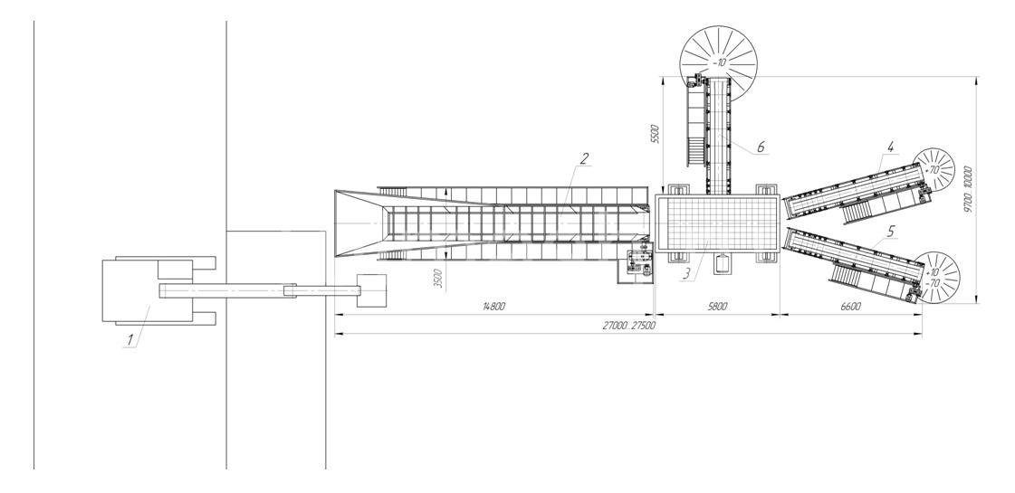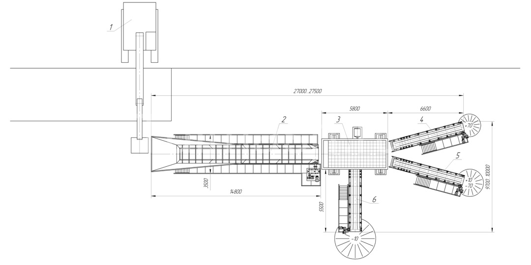 - Далее материал поступает в транспортную систему, представляющую собой блок ленточных конвейеров (поз. 4, 5), которые ссыпают каждый свою фракцию в транспортную тару или накопительные конусы.