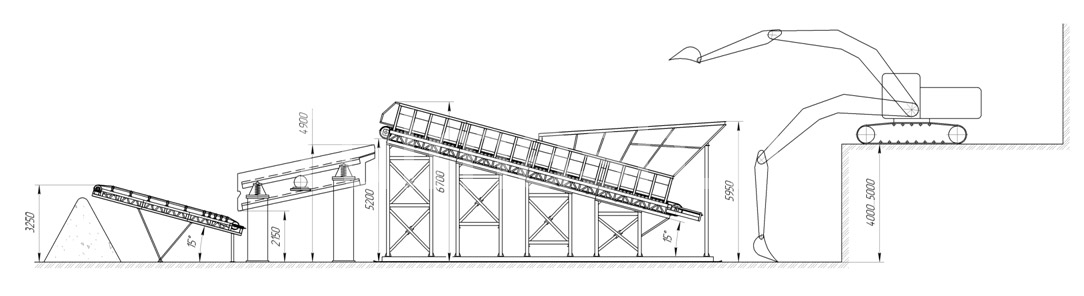 - Исходный материал загружается в бункер ленточного питателя ящичного типа (поз. 2) экскаватором (поз. 1). Для снятия ударных нагрузок материал рекомендуется загружать по склизу, находящемуся в торцевой части питателя над натяжным барабаном.
